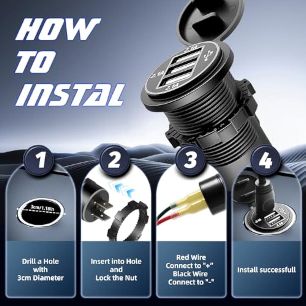 | 3 Usb Ports Design: Equipped With Three Usb Ports, Each Rated At 2.1A, This Charger Allows You To Charge Three Devices Simultaneously, Providing Optimal Charging Speed For All Your Gadgets. | | Blue Led Indicator: The Built-In Blue Led Light Makes It Easy To Find The Charging Ports In Low-Light Environments And Visually Confirms When The Connection Is Successful. | | Waterproof And Dustproof: The Robust Pc Cg Is Scratch-Resistant, And The Pvc Cover Cap Provides Additional Protection Against Water Splashes And Dust, Ensuring Durability And Reliability In Harsh Conditions. | | Simple Installation: Installation Is Quick And Easy—Just Drill A 1.18-Inch (3Cm) Round Hole, Insert The Usb Charger, Tighten The Screw, And Connect The Positive And Negative Terminals For A Hassle-Free Setup. | | Wide Compatibility: This Charger Is Compatible With Most 12V/24V Vehicles, Including Cars, Motorcycles, Buses, Boats, Rvs, And More, Making It A Versatile Choice For A Variety Of Transportation Types. | |