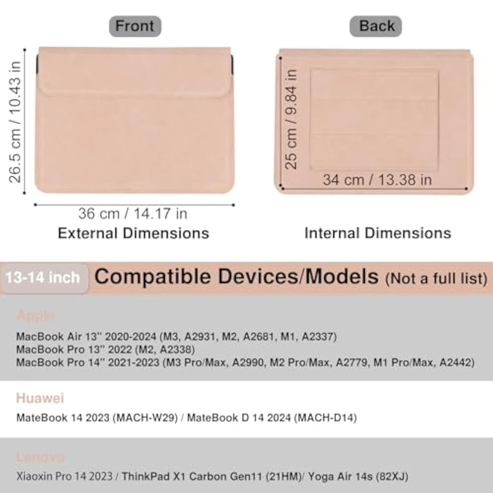 | Dimension: External Dimensions: 14.17 X 10.43 Inches. Internal Dimensions: 13.38 X 9.84 Inches. Please Measure Before Purchasing. (The Sum Of The Width (Length) And Thickness Of Your Laptop Should Be Less Than The Internal Width (Length) Of The Sleeve). Compatible Models: Macbook Air 13 2018-2024 (M2 A2681 M1 A2337 A2179 A1932)/ Macbook Pro 13 2016-2024 (M2 A2686 M1 A2338 A2251 A2289 A2159 A1989 A1706 A1708) | | Computer Stand?The Back Of The Stand Contains A Natural Adsorption Bracket Plate That Can Be Folded And Used As A Temporary Stand, Which Is Not Only Comfortable For Typing And Leaves Space To Help Dissipate Heat From The Computer, But Also Naturally Adsorbs To Avoid The Awkward Sound That Comes With The Velcro Version Of The Stand When It Is Glued On | | Envelope Opening: Envelope Design With Invisible Magnetic Closure Can Allows More Easy Access To Your Laptop, But Prevents Your Macbook From Slipping Out | | Lightweight Slim: Can Be Carried Alone Or Slip Into A Backpack, Briefcase Or Suitcase Without Adding Too Much Weight, Bringing More Convenience At School, Office Or During Travel | | Accessory Pouch: Comes With A Practical Accessory Pouch For Mouse, Charger, Data Cable, Mobile Power Or Other Peripherals And Other Accessories. The Handle Of The Accessory Pouch Makes It More Convenient To Carry | |
