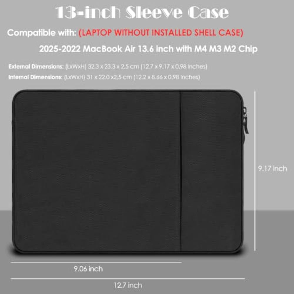 | External Dimensions: (Lxwxh) 12.7 X 9.17 X 0.98 Inches / 32.3 X 23.3 X 2.5 Cm. Internal Dimensions: (Lxwxh) 12.2 X 8.66 X 0.98 Inches / 31 X 22.0 X2.5 Cm | | Compatible With: Fit For 2025-2022 Macbook Air 13.6 Inch (M4 / M3 / M2 Chip, A3240/A3113/A2681), 2023-2020 Macbook Air 13 Inch (M1 Chip, A2337), 2019-2018 Macbook Air 13 Inch (With Touch Id, A2179 / A1932), 2022-2020 Macbook Pro13 Inch (M2/M1 Chip, A2338), 2019-2016 Macbook Pro13 Inch (With Touch Bar, A2289 / A2251 / A2159/ A1989 / A1706), Macbook Air 11.6 Inch, Macbook Retina 12 Inch, 2021 Ipad Pro 12.9 Inch, Surface Pro X 1 / 2 13 Inch, Surface Laptop Go 1 / 2 12.4 Inch | | Water-Resistance And Durable: This Sleeve Case Is Made Of Premium And Durable Polyester, And It Is Composed Of 3 Protective Layers: 1) Water-Resistant Outer Layer, 2) Soft-Touch Suede Interior And 3) Middle Cushioning Pad To Protect The Full Body Of Your Laptop From Dust, Dirt, Scratch, Bump, Rainwater And Splashing Liquid | | Extra Attached Pocket: The Extra Pouch Is For Stylus, Mobile Phone, Mouse, Charger Cable And Other Small Accessories Of Laptop | | Top Double Zippers: It Is Easy To Secure And Access Your Laptop Through The Smooth Double Metallic Zippers On The Top Of Sleeve Case | | Simple Sleeve Case: This Sleeve Case Is Compact, Fashion And Light Weight (165G=5.82Oz) Design, Which Makes This Case Is Easy To Carry On Your Hand And Slide Into Backpack | | Applications: This Sleeve Case Is For Home, Office, Traveling And Business | |