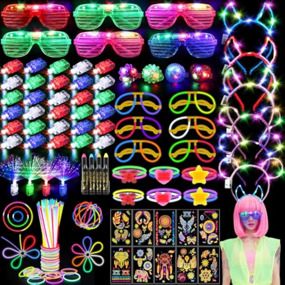 | 130Pcs Glow In The Dark Party Favors --- Rich Variety Of Light Up Toys Accessories For Glow Party, Includes 6 * Led Glow Glasses, 6 * Light Up Headbands, 4 * Light Up Rings, 4 * Led Fiber Optic Finger Lights, 30 * Color Changing Finger Flashlights, 50 * Glow Sticks, 10 * Washable Temporary Tattoos, 4 * Glow Crayons, 4 * Ball/Flower Connectors, 6 * Bracelet Connectors, 6 * Glow Glasses Molds, 50 * Normal Connectors. Ultra Bright Glow In The Dark Stuff And Accessories For Neon Glow Party Supplies, Neon Party Favors, Neon Party Decorations And Props, New Years Eve Party Supplies 2026. | | Safe And Long Lasting Glow Party Supplies --- All Glow Party Accessories Are Made From Non-Toxic Materials, Ensuring That They Are Safe For Children And Adults. Neon Accessories For Glow Party Pack Come With Multi Kinds Of Led Party Favors Toys. 30Pcs Color Changing Finger Lights Will Be A Huge Hit At Christmas, Easter Egg Decoration, Festivals Prizes And More! 4 Rings And Led Fiber Optic Finger Lights. Light Up Glasses And Headbands Have 3 Modes: Fast Flashing, Slow Flashing Constant. Easy To Use With Off/On Swtich. Keep Giving Out Cool Lights Until The Last Minute Of Glow Day Party. | | Diy Glow Sticks Bulk Party Pack --- Super Bright 8-Inch Neon Colors Glow Sticks Bulk Offer 8 Vibrant Colors Including Blue, Green, Yellow, Orange, Pink, Purple, Red, White, Which Bring Endless Fun To Kids And Adults. Glowsticks Comes With Various Of Modes And Connectors, Easy To Diy Glow Stick Glasses, Glow Stick Necklaces And Bracelets, Glow Balls And Flowers. Just Use Your Imagination To Create More Glow Party Decorations And Accessories. Perfectly Make You Stand Out Of The Dark In Glow Parties. All Kids Teen Will Love The Party Light Up Accessories. | | Bonus Temporary Tattoos Stickers Uv Body Paint --- Enhance The Fun With Our Included Temporary Tattoos And Neon Face And Body Paint. 10 Sheet Glow In The Dark Temporary Tattoos Have Lots Of Trendy Styles! These Glow In The Dark Face Paint Cannot Glow In The Dark Directly. Shine Mysteriously In The Dark And Burst Into Neon Colors Under Uv Lights! This Neon Body Paint Is Very Easy To Apply On The Body And Washable. Ideal For Creative Expression At Any Party. Customize Your Guests' Looks While They Enjoy The Festivities, Creating Memorable Experiences. | | Perfect For Any Celebration --- Both Kids And Adults Can Have Fun With These Party Glow Sticks And Led Light Up Party Accessories. Suitable For All Kinds Of Glow Parties, Such As Glow Halloween Party Favors, Christmas, New Year'S Eve Party Supplies 2026, Birthday Party Supplies, Disco Party Supplies, Dance Party Favors, Kids Party Supplies Etc. Also Perfect For Night Activities, Double As Fun Camping Accessories For Kids, Rave Festival Accessories, School Event, Wedding Dance Floor Props Etc. Transform Your Party Into A Glowing Wonderland That Will Captivate Guests Of All Ages. | |