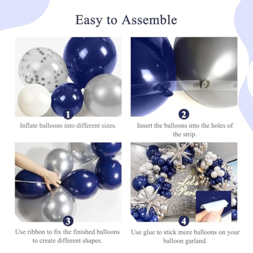 This navy blue, silver, and white balloon garland kit includes 62 navy blue balloons (18-inch x2, 12-inch x10, 10-inch x20, 5-inch x30), 37 metallic silver balloons (18-inch x2, 10-inch x15, 5-inch x20), 20 white balloons (12-inch x10, 5-inch x10), and 10 silver confetti balloons (12-inch). It also comes with a 32-foot ribbon, 60 glue dots, and a decorative strip for easy assembly. Made from high-quality latex, these balloons are durable and can be filled with air or helium. For best results, use a balloon pump and avoid overinflation. The kit includes ribbon, glue dots, and a decorative strip to simplify the setup process. Perfect for birthdays, weddings, anniversaries, graduations, baby showers, bridal showers, and other celebrations, this stylish blue and silver balloon garland adds an elegant touch to any event.