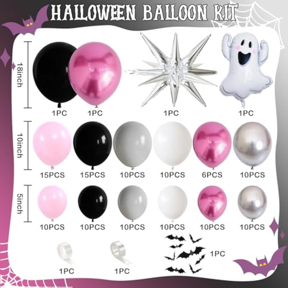Elevate your spooky celebrations with this 131-piece Halloween Balloon Arch Kit, featuring a mix of silver star and ghost balloons, 3D bat stickers, and assorted balloons in pink, black, magenta, silver, white, and gray, available in sizes 18”, 10”, and 5”. Complete with a balloon chain and 100 glue dots for easy setup, this kit allows you to design a stylish and eerie balloon garland. Made from durable latex, the balloons are strong, stretchy, and reusable, suitable for filling with either air or helium to create floating or wall-mounted displays. Perfect for girls’ spooky parties, haunted house setups, Halloween weddings, themed birthdays, or photo backdrops, these pink Halloween decorations bring a fun yet haunting vibe to any event. For best results, avoid heat, sharp objects, or rough surfaces, as slight color variations may occur when inflated or under different lighting.