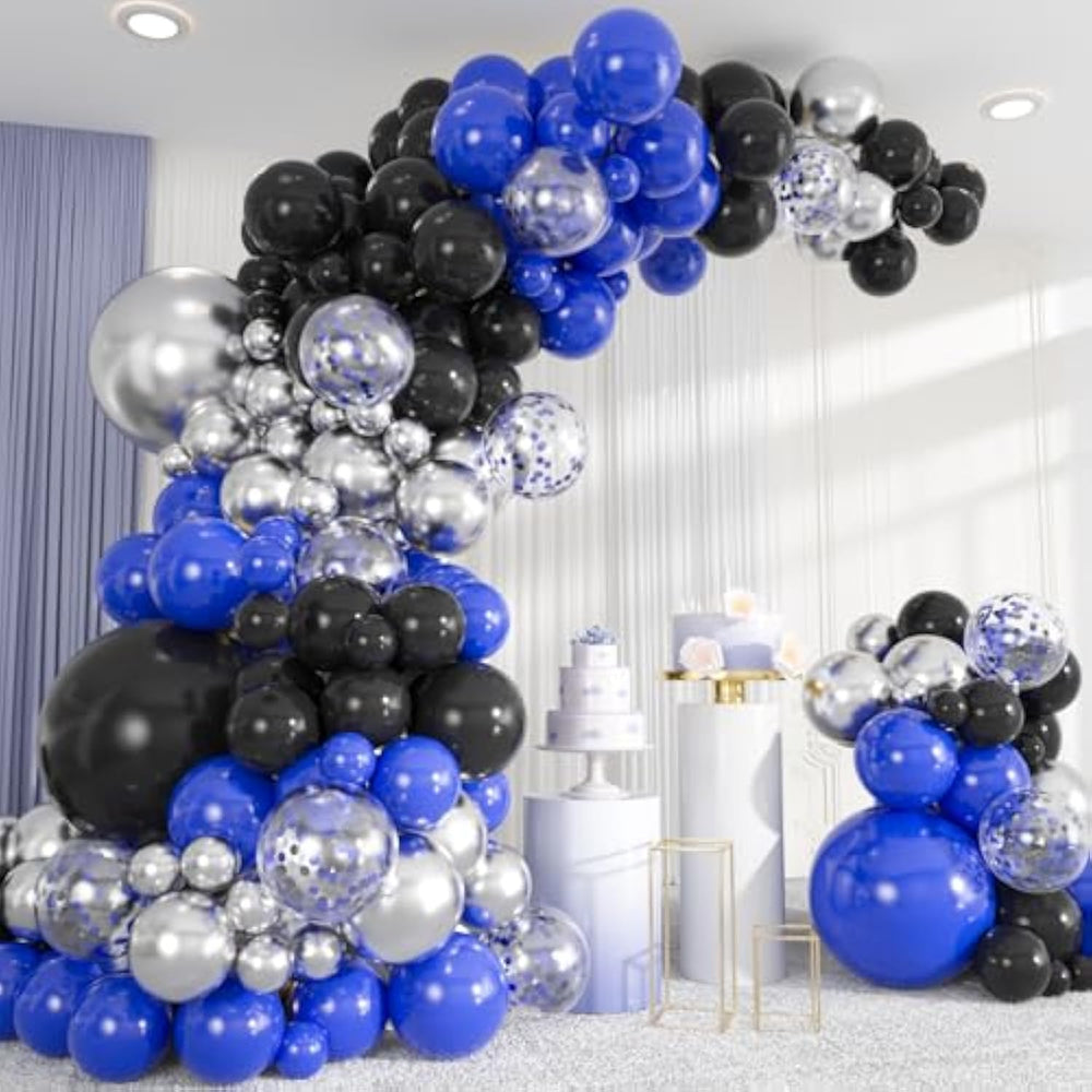 | Blue Black Silver Confetti Balloons Set : You Will Get 133Pcs Blue Silver Black Balloon Arch Kit In 18Inch 12Inch 10Inch 5Inch Different Size Pack, Includes 41 Royal Blue Balloons, 41Metallic Silver Balloons, 41 Black Balloons, 10 Black Silver Confetti Balloons. 2 Ribbons And 100 Balloon Glues. Easy To Make 10Ft -20Ft Blue Balloons Garland. | | High Quality : These Blue And Silver Party Balloons Set Is Made Of High Quality Latex Material, Durable And Won'T Easily Pop ,They Can Maintain Shapes For A Long Time.You Can Use It With Confidence. Can Be Inflate With Both Air And Helium. Indoor And Outdoor Use. | | Easy To Setup : These Blue And Black Party Decorations Come With 3 Tools Including 2 Ribbons, 100 Glues. First, Inflate The Different Sizes Balloons And Tie The Balloon Knots Together With Decorative Chain Or Fishing Line. Second, Stick The Balloon Garland On A Party Background With Ribbon. Finally, Use Dot Glue To Stick 5 Inch Balloons Onto The Balloon Arch To Fill In The Gaps. | | Widely Applications : We Combines Royal Blue Balloons, Black Balloons, Metallic Silver Balloons Together Will Creates A Touch Of Luxury And Elegance. Not Only Great For Baby Boy Baby Shower, Retirement, Bridal Shower, Engagement, Birthday, Gender Reveal, Wedding, Bachelorette, Anniversary, Class Of 2025 Graduation, But Also Perfect For Independence Day, Christmas, Father’S Day, New Year Eve Party Supplies. | | Warm Reminder : Keep Sharp Objects At A Distance To Prevent Accidental Punctures. Choking Hazard: Discard The Broken Balloons At Once, Balloons Should Always Be Used Under Adult Supervision To Ensure Children'S Safety. | |