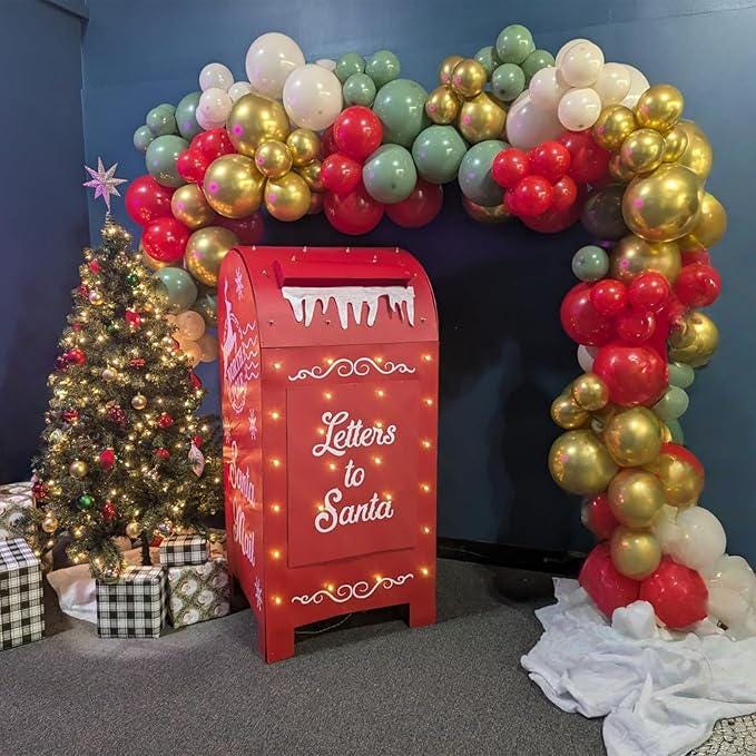 This 133-piece Christmas balloon arch kit includes a festive mix of red, sage green, sand white, gold, and ivory white balloons in assorted sizes, along with candy and candy cane foil balloons. The set also comes with a balloon arch strip and glue dots for easy setup. Made from thick, high-quality latex, the balloons are durable, reusable, and safe to use for multiple celebrations. Featuring a classic yet elegant color palette, this balloon kit adds warmth and charm to your holiday decor. Perfect for Christmas parties, family gatherings, weddings, school events, and photo backdrops, it helps create a joyful and festive atmosphere both indoors and outdoors.