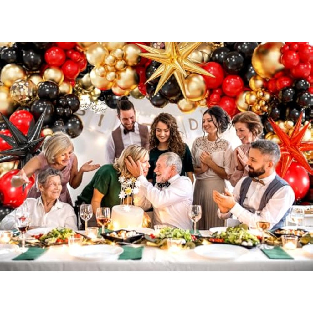 This 135-piece red, black, and gold balloon garland kit includes a variety of balloons to create a stunning party display. The set features 51 black balloons in multiple sizes, 46 red balloons, 27 metallic gold balloons, 5 gold confetti balloons, and three 22-inch star-shaped balloons in red, black, and gold. It also comes with a 32-foot ribbon, 100 glue dots, and a decorative strip for easy assembly. Made from high-quality materials, these balloons are durable and resistant to bursting. They can be filled with air or helium, with a balloon pump recommended for quick inflation. To maintain the perfect shape, avoid overfilling. The kit includes essential tools to simplify the setup process. Inflate the balloons, attach them to the decorative strip, secure the garland with ribbon, and use glue dots to fill in gaps with smaller balloons. Perfect for anniversaries, parties, New Year's celebrations, and birthdays, this elegant balloon kit adds a stylish touch to any event.