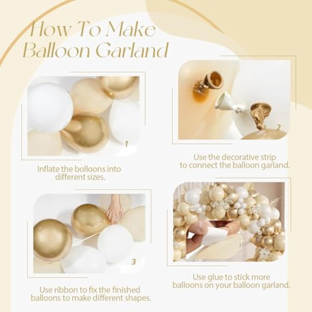 | Package Include:Our White And Gold Balloon Arch Kit Includes 52Pcs Sand White Balloons(18Inchx2, 12Inchx10, 10Inchx20, 5Inchx20), 40Pcs White Balloons(10Inchx20, 5Inchx20), 40Pcs Metallic Gold Balloons(10Inchx20, 5Inchx20), Glue Dotsx100, Ribbonx1, Decorative Stripx1 | | Great Quality:Our Gold And White Balloons Are Made Of Great Quality Latex, Which Is Thick Elastic And Not Easy To Pop. The Balloons Can Be Filled With Air Or Helium, Which Can Last For A Long Time | | Easy To Use:The Boho Balloon Arch Kit Is Easy To Install. We Will Provide 3 Balloon Tools Including Ribbon, Glue Dots, And Decorative Strip. After Inflating The Balloons In The Wedding Balloon Arch Kit, Use The Decorative Strip Tool To Tie The Latex Balloons Together, Then Secure Them To The Wall With Tape Or Glue, Creating A Beautiful Bridal Shower Balloon Arch That Will Provide A Visual Feast And Won'T Cost You Too Much Time. This Will Be A Fun Diy Process | | Widely Applications:Excellent For Various Occasions, The Neutral Balloon Arch Kit Is Excellent For Graduations, Engagement Party Decorations, Anniversaries, Unique Themed Parties, Wedding, Birthdays, Bridal Shower Balloons, And Boho Baby Shower Decorations, Photography, Baptism Decorations And More. Capture Unforgettable And Lasting Memories With Family Under The Faultless Balloon Garland | | Warm Reminder: If You'Re Not Happy With The Balloon Arch Kit For Any Reason,We Will Work Hard To Solve The Problem Until The Problem Is Resolved. We'Re Committed To Providing You With Great Service And Helping You Create The Great Party Atmosphere | |