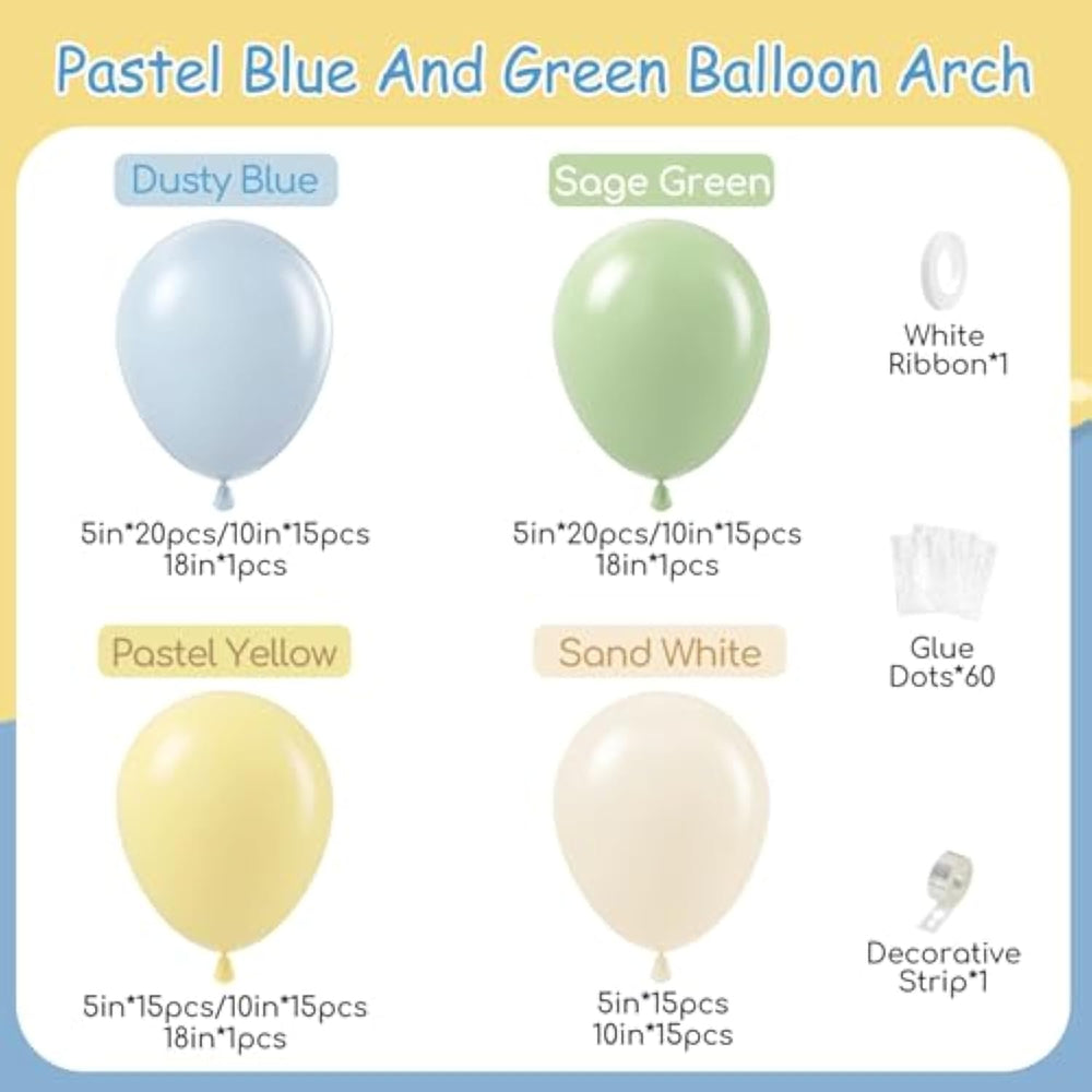 | What You Will Get: The Blue And Green Balloon Arch Kit Includes 36Pcs Dusty Blue Balloons(18Inchx1, 10Inchx15, 5Inchx20), 36Pcs Sage Green Balloons(18Inchx1, 10Inchx15, 5Inchx20), 31Pcs Pastel Yellow Balloons(18Inchx1, 10Inchx15, 5Inchx15), 30Pcs Sand White Balloons(10Inchx15, 5Inchx15), White Ribbonx1, Decorative Stripx1, Glue Dotsx60 | | Great Balloons: These Dusty Blue And Yellow Balloons Are Made Of Great Latex, Which Is Thick And Not Easy To Pop. They Can Be Filled With Air Or Helium, Lasting A Long Time When Properly Inflated. To Ensure The Good Experience, Inflate Quickly With A Balloon Pump And Avoid Overinflating To Maintain Their Shape | | How To Use: Inflate Baby Shower Balloons Into Various Sizes With A Pump, Then Group The Balloons Into Clusters By Crossing Them Over And Tie Them With A Decorative Strip Or Ribbons. Arrange The Clusters Into An Arch Shape. Finally, Use Glue Dots To Fill Any Space With 5In Balloons For A Fuller Look | | Wide Application: The Blue And Green Baby Shower Balloon Arch Kit Is Good For Various Occasions, Such As Birthday Party Decorations, Baby Shower Decorations, 1St Birthday Decorations, Gender Reveal Decorations | | Warm Reminder: We Are Dedicated To Providing Good Service. If You Have Any Issues With The Baby Shower Balloon Arch Kit. We Will Work Hard To Solve It | |
