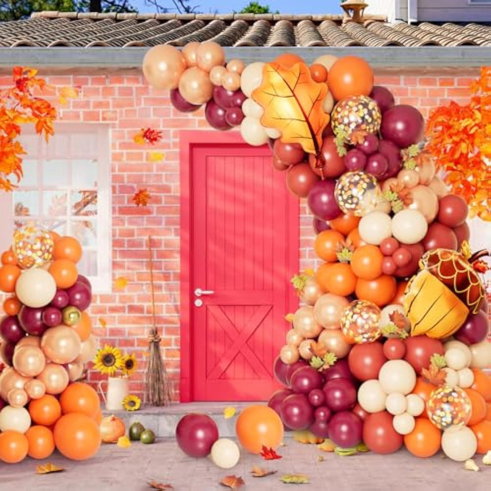 This fall balloon arch kit includes 138 balloons in various sizes and colors: orange, dusty pink, wine red, rose gold, and skin tone, along with 6 confetti balloons, maple leaf and pine cone foil balloons, balloon ribbon, a 16ft strip tape, and 100 glue dots. Made from thick, non-toxic natural latex, the balloons hold their shape well and resist popping, ensuring a long-lasting display. Easy to assemble with the included tools, this DIY balloon garland adds a vibrant seasonal touch to Thanksgiving, autumn birthdays, bridal showers, and other fall celebrations, making it a fun and creative decoration for unforgettable parties.