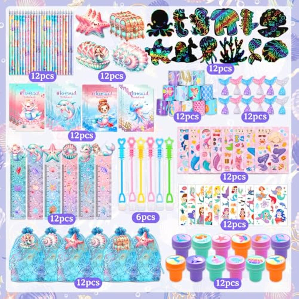| Mermaid Stationery Set Package Include: Exquisite Mermaid Party Favors Includes 12Pcs Mini Notebook ,12Pcs Stamps,12Pcs Rulers,12Pcs Mermaid Pencils,12Pcs Mermaid Make-A-Face Stickers,12Pcs Mermaid Stickers,12Pcs Color Scratch,12Pcs Slap Bracelets,12Pcs Mermaid Tails Toy, 12Pcs Mermaid Card ,6Pcs Mermaid Bubbles Water,12Pcs Mermaid Organza Drawstring Bags, 138 Pcs In Total! A Full Mermaid Stationery Gift Set, Perfect For All Your Little Mermaid Party Decorations Needs. | | Little Mermaid Birthday Party Favors Suitable Size: Mermaid Mini Notebook 4.4X6.7 Inch, Color Scratch 3.1X3.9 Inch, Pencils 7.5 Inch, Ruler 7.9 Inch, Slap Bracelets 8.7 X 0.2 Inch, Stampers 1.38 Inch, Mermaid Stickers 5.1 X 3.1 Inch, Bubbles Water 4.13 Inch, Mermaid Card 2.36X2.4 Inch, Mermaid Tails Toy1.6 Inch. Rather Than Being Tossed Into A Bag, Little Mermaid Party Decorations Are Thoughtfully Arranged In A Charming Mermaid Box, Making The Overall Gifting Experience More Special. | | Premium And Materials: Elegant Mermaid Party Favors Set Are Mainly Quality, Reliable Material, Lightweight And Easy To Hold For Long-Term Use.Each Mermaid Goodie Bags Is Carefully Chosen For Its Ability To Combine Aesthetic Peal With Practical Functionality, Perfect Choice For Mermaid Birthday Party Favors. | | Fun Diy Mermaid Party Favor Design: The Mermaid Goodie Bags Skillfully Combines A Variety Of Marine Life Elements, Such As Mermaids, Shells, Starfish, Etc., With A Unique Design. The Mermaid Party Favors Overall Color Tone Is Dominated By Soft Purple, Which Looks Both Fresh And Energetic, And Is Both Cute And Playful, Perfectly Fitting The Ocean Theme And Giving A Dreamy And Beautiful Atmosphere. | | Mermaid Birthday Party Favors Occasions: Mermaid Party Favor Bags And Stationery Are Perfect For A Variety Of Occasions, Including Little Mermaid Party Favors ,Mermaid Birthday Decorations, Summer Party, Fairy Tale Party, Tea Party, Princess Party, Wedding, Baby Showers, And Back To School Classroom Activities, Graduation Gift Etc. | |