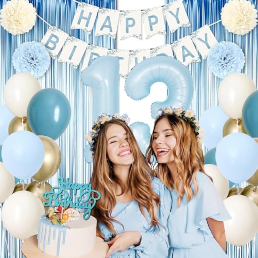 | 13Th Birthday Decorations Blue: The Package Contains 12 X Dusty Blue Balloons, 12 X White Sand Balloons,12 X Baby Blue Balloons, 9 X Gold Metallic Balloons, 4 X Paper Pompom Flowers, 1X Light Blue 13 Balloon Numbers, 1 X Blue Happy Birthday Banner, 1 X Blue Gold Tablecloth, 2 X Blue Fringe Curtain 1 X 2 M, 10G Blue Sliver Confetti, 1 Cake Topper, 1 X Ribbon | | Quality 13Th Birthday Balloons: The Blue White And Gold Balloons Are Made Of High-Quality Latex, Strong And Durable. It Is Easy To Assemble In A Short Time, The Streamers Can Be Hung On The Ceiling, Mounted On Walls And Windows Or Used As Centerpieces To Decorate Your Birthday Party. Create A Dreamy And Unforgettable Light Blue 13 Birthday Party For 13 Birthday Boy And Girls | | Curtains And Table Confetti: Metallic Fringe Curtains That Sparkle Under The Light, Can Highlight The Party Atmosphere Well And Create A Unique Birthday Party With Baby Blue White Gold Balloons. The Blue Gold Tablecloth Measuring 54 Inches X 72 Inches, Meets Your Requirements For Covering Your Table, And 10G Of Confetti Will Be Scattered Over It. Decorate Your Table To Make The Light Blue 13Th Birthday Party Unique, Attractive And Eye-Catching | | Easy To Assemble: The Combination Of Sand White And Light Blue Balloons Makes Your Party More Gorgeous And Elegant, The Confetti Brings Fantastic Feelings, Creating Unforgettable Party Memories. Metallic Fringe Curtains And Light Blue Birthday Decor Set Are Easy To Assemble, Suitable For Any Birthday Party, They Can Be Sparkling Photo Backdrop, Create A Happy Atmosphere, Definitely Impress The Guest Deeply On Your Birthday Party | | 13 Birthday Girl Boy Decorations: You Can Assemble The Alphabet Of The Birthday Decoration Very Easily And String These Flags Together Yourself. Blue Party Decorations Can Be Reused On Many Occasions. The Color Is Perfect For 13 Year Old Girl Birthday Decorations Light Blue Birthday Decorations, And Happy Birthday Cake Topper, Happy Birthday Banner, All-In-One Kit Is Perfect For Creating An Elegant And Dreamy Happy 13Th Birthday Party | |