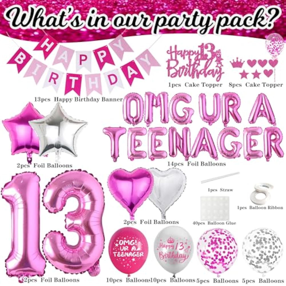 | 13Th Party Decorations: Includes 30 X Latex Balloons, 8 X Cake Topper, 13 X Banner, 14 X Letter Foil Balloons, 2 X Heart Balloon, And 2 X Star Balloon, 2 X Number Balloon. Suitable For Creating A Festive Atmosphere For A 13Th Birthday Celebration | | Assemble In No Time: Featuring Banners And Easy-To-Inflate Balloons, Our Teenager Decorations Kit Ensures You Can Assemble Everything In No Time. Spend Less Time Setting Up, Ensuring Your Child'S 13Th Party Is A Memorable Experience For Everyone | | Versatile Usage: Suitable For 13Th Birthday Party, Or Teenage Gatherings. These Hot Pink Birthday Decorations Can Be Used In Various Settings, Including Party Venues, Or Outdoor Spaces, Making Them A Versatile Choice For Creating Memorable Celebrations | | Inflation Tips For Foil Balloons: Please Note That Foil Balloons Are Not Elastic. Inflate Slowly And Avoid Using An Automatic Air Pump To Ensure The 13Th Birthday Balloons Maintain Their Shape And Longevity | | Unforgettable Memories: Create A 13Th Birthday Party Atmosphere With "Omg Ur A Teenager" Decorations. These 13Th Party Supplies Not Only Enhance The Party'S Visual Appeal But Also Help Create Cherished Memories As Your Child Steps Into Their Teenage Years | |