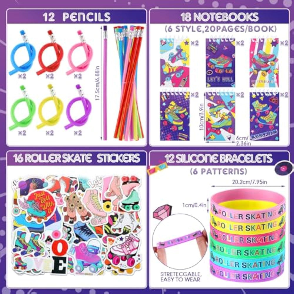 | Comprehensive Roller Skate Party Favors: Our Package Includes 12 Roller Skate Drawstring Backpacks, 12 Skate Party Silicone Wristbands, 18 Roller Skating Spiral Notepads, 12 Roller Skate Badges, 12 Roller Skate Keychains, 12 Roller Skating Pencils, 12 Roller Skate Slap Bracelets And 50 Roller Skate Stickers; All Combined In A Single Comprehensive Pack Of 140 Items | | Roller Skate Theme: Our Roller Skating Party Favors Feature An Assortment Of Roller Shoes Elements With Eye Catching Retro Hues And Creative Patterns; Immerse In The Vibrant Roller Skate Theme With Assorted Styles And Bright Colors That Captivate Children'S Attention And Add A Fun Touch To The Party Or Gathering | | Fine Workmanship: Look No Further For Colorful Roller Skate Party Decorations; Your Set Will Be The Talk Of The Party With Our Fine Workmanship, Clear Printing, And Firm Materials Which Are Not Easy To Fade, Deform, Or Fracture Over Time | | Educational And Interactive: Our Roller Skate Decorations Like Spiral Notebooks And Bendable Pencils Offer An Exciting Opportunity For Kids To Improve Fine Motor Skills, Spark Creativity, And Practice Writing; Moreover, Vibrant Stickers Can Heighten Problem Solving Capabilities And Drive Imagination Through Interactive Play | | Multiple Use: Our Skate Party Decorations Are Flexible And Versatile; Use Them As Party Essentials, School Materials, Or Even As Educational Tools; Whether It'S A Birthday Party, Baby Shower, Holidays, Festivals, Class Activities Or Other Events, It Can Be Applied As An Exquisite Gift Set For Kids | |