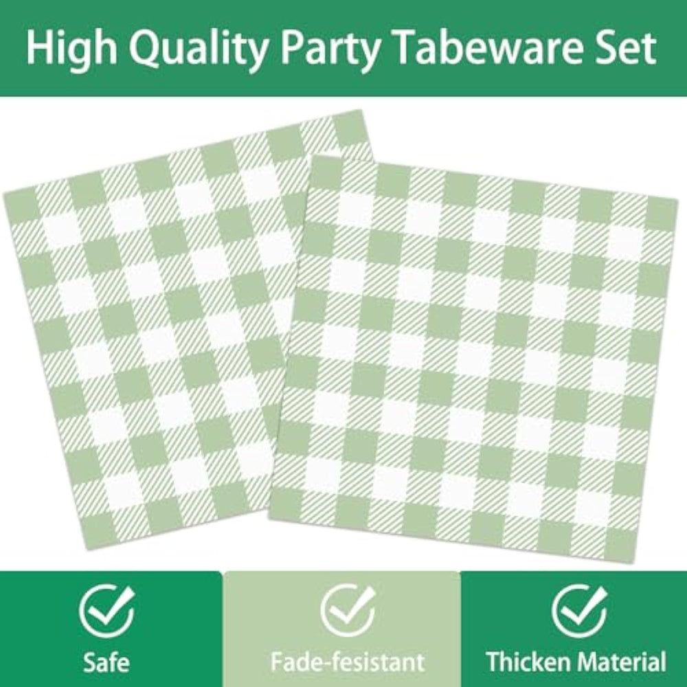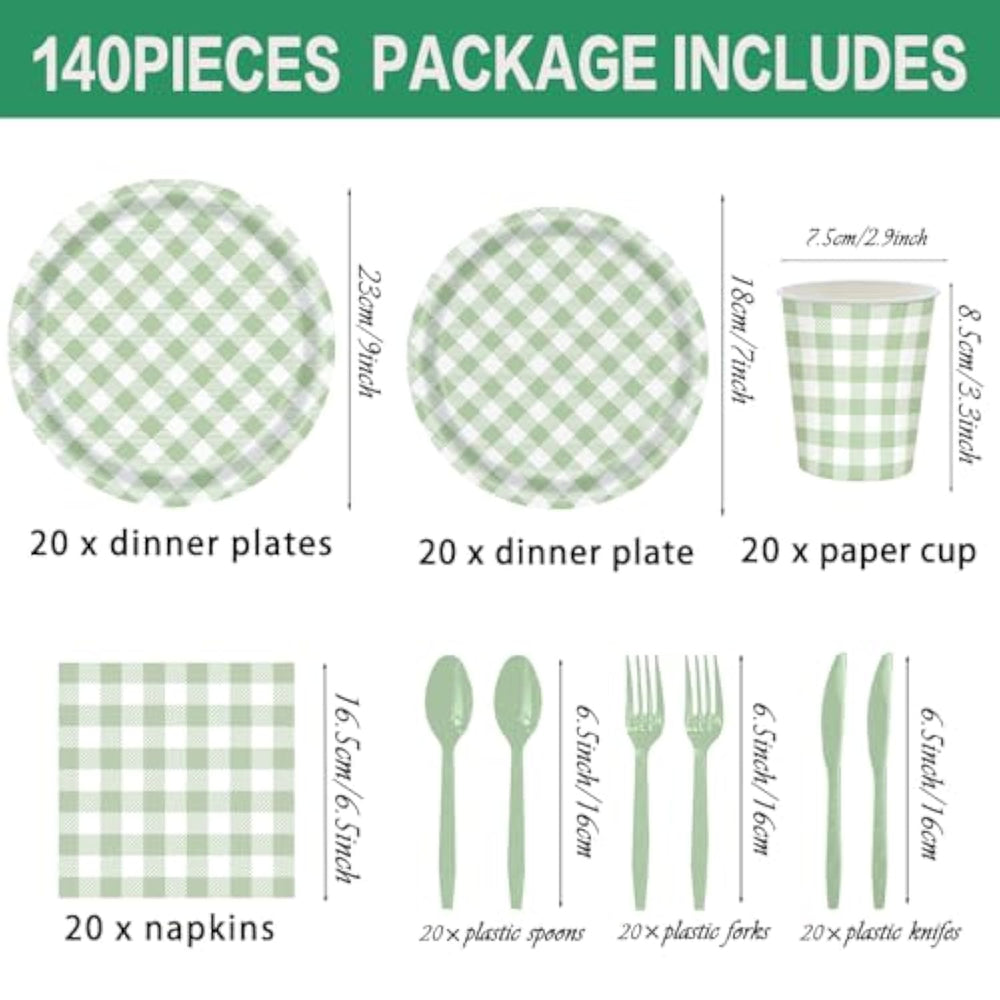 | Complete Set: 140-Piece Party Supplies Set Includes Plates, Cups, Napkins And Cutlery In Elegant Sage Green And White Gingham Pattern For 20 Guests | | Package Contents: Includes Dinner Plates, Beverage Cups, Decorative Napkins, Plus Matching Plastic Knives, Forks, And Spoons For A Coordinated Look | | Sturdy Construction: Thick Paper Plates And Quality Disposable Cutlery Ensure Reliable Performance Throughout Your Entire Event | | Versatile Design: Classic Gingham Pattern In Soft Sage Green And White Creates A Charming Backdrop For Any Occasion From Baby Showers To Wedding Celebrations | | Convenient Sizing: Perfect Portions For Full-Size Servings With Standard Dinner Plates And Generously-Sized Cups Suitable For Hot Or Cold Beverages | |