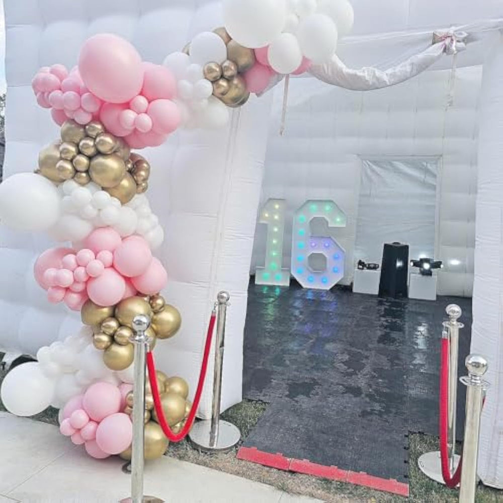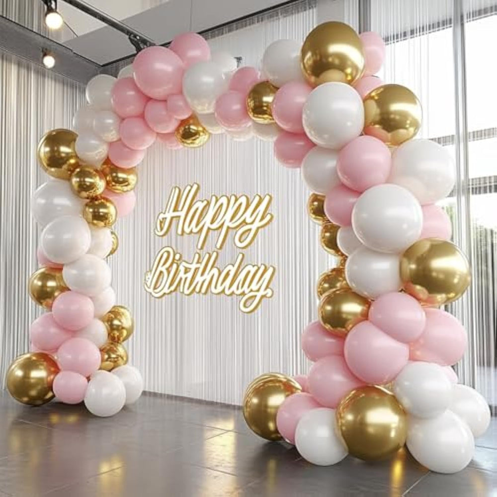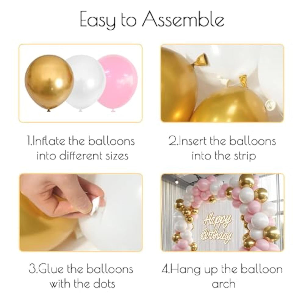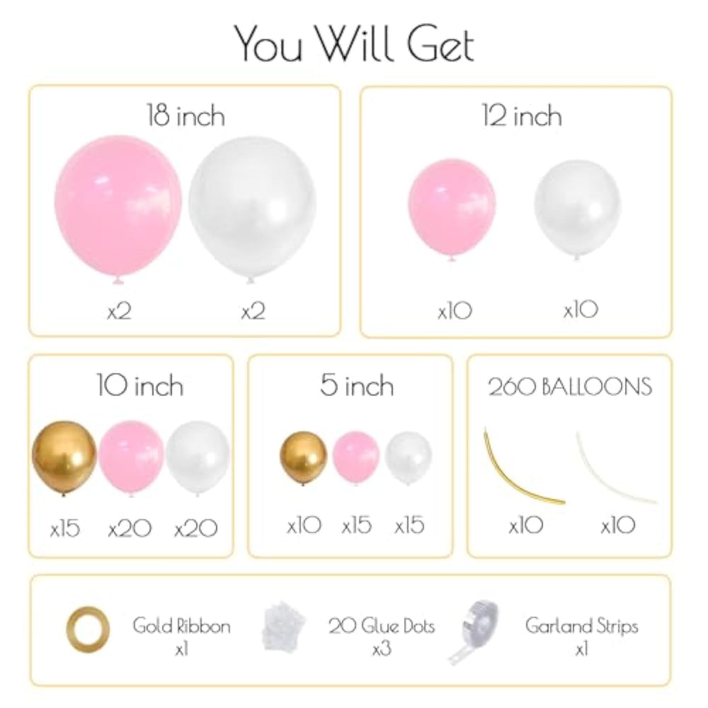 This pastel pink, white, and gold balloon garland kit includes 47 pink balloons (18", 12", 10", 5"), 47 white balloons (18", 12", 10", 5"), 25 gold balloons (10", 5"), 20 long 260 balloons (10 white, 10 gold), a 16ft balloon arch strip, 60 glue dots, and a 33ft gold ribbon, providing everything needed for a stunning balloon arch. Made from durable, non-toxic latex, these balloons can be filled with air or helium and are designed to last. For easy assembly, inflate and tie the larger balloons onto the arch strip, secure the garland with glue dots or ribbon, and fill in gaps with smaller balloons for a professional look.