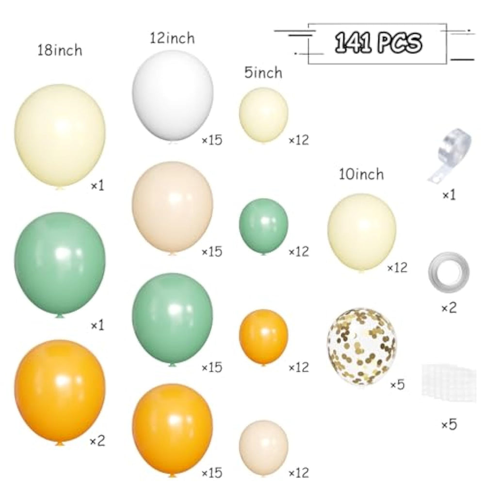 This 141-piece balloon arch kit includes sage green, matte orange, pastel yellow, sand white, gold confetti, and white balloons in assorted sizes, along with balloon strip, glue dots, and ribbon for easy setup. Made from natural latex that is non-toxic and long-lasting, these balloons can be filled with air or helium to suit your decoration needs. The kit allows you to enjoy a fun DIY experience while creating a beautiful garland arch, making it ideal for graduations, weddings, anniversaries, engagements, baby showers, corporate events, photo backdrops, and more.