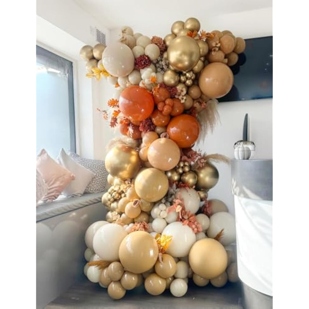 This 143-piece Fall Balloon Arch Kit includes sand white, pastel orange, burnt orange, and metallic gold balloons in multiple sizes, along with a balloon chain, glue dots, and ribbon for easy DIY assembly. Made from thick, non-toxic latex, the balloons are durable, vibrant, and resistant to popping, making them ideal for garlands or arches. Perfect for Thanksgiving, fall weddings, harvest festivals, autumn birthdays, and “Little Pumpkin” baby showers, this kit creates a warm, festive atmosphere and a stunning backdrop for photos and gatherings.