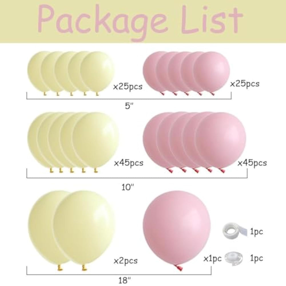 This pastel pink and yellow balloon garland kit is perfect for creating a warm and sweet party atmosphere. It includes 71 light pink and 72 macaron yellow latex balloons in 5-inch, 10-inch, and 18-inch sizes, along with a balloon arch and a roll of balloon dot glue for easy assembly. Designed for versatility, this balloon kit is ideal for baby showers, birthdays, weddings, or a bear and honeybee-themed celebration. The carefully chosen color palette adds a charming touch, making it a great choice for those with limited budgets and preparation time while still achieving a beautiful and festive look.