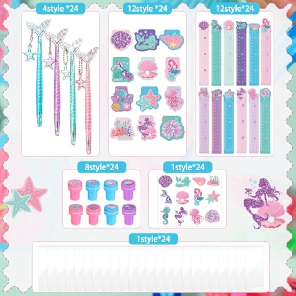 | 24 Sets Mermaid Party Favors: The Mermaid Stationery Set Includes 24 Mermaid Notepads, 24 Mermaid Pens, 24 Large Mermaid Stickers, 24 Mini Cute Stampers(0.8 Inch), And 24 Rulers, Coming With 24 Sets Of Mermaid Gift Bags And Tools For Wrapping; The Ample Quantity And Diverse Styles Can Easily Meet Your Daily Usage | | Adorable Mermaid Theme: The Mermaid Theme Party Favors Feature Lovely Mermaid Ocean Themed Elements With Pastel Colors, Like Mermaid, Seashells, Seaweed, Starfish, Conch, Vivid And Cute, Which Greatly Fit The Mermaid Theme, And Will Be Popular With Mermaid Lovers | | Nice Party Gifts And Gift Bags Stuffers: These Mermaid Birthday Party Supplies Are Suitable For Various Occasions, Such As Girls Mermaid Birthday Parties, Mermaid Theme Party, Ocean Party, Under The Sea Party, Beach Party; Can Also Be Applied As School Classroom Rewards Gifts, Teacher Prizes, Piñata Fillers, Goodie Bags Fillers | | Quality Material: The Mini Mermaid Notebooks And Stickers Are Made Of Paper, Each Notepad Has 20 Inner Pages; The Stamp And Ruler Are Made Of Plastic, Sturdy To Use; You Can Give These Nice Mermaid Prizes As Heartwarming Class Gifts Or Rewards To Whom Like Mermaids Or Cute Things | | Proper Size: These Meirmaid Party Favors Decoraitons Are In Small Size, The Meirmaid Notebook Measures About 2 X 2.8 Inches, Meirmaid Stickers Are About 5.5 X 6.7 Inches, The Ruler Is About 1.2 X 7.9 Inches, Meirmaid Pens Are About 4.72 Inches Long, Easy For Little Hands To Hold And Pack In Schoolbags | |