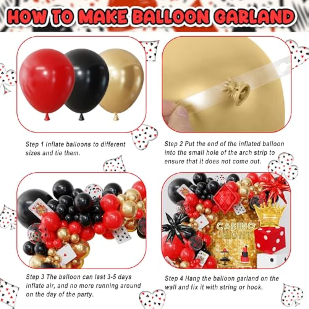 | Casino Theme Party Decorations: Our Package Includes 12'' Dice Favor Boxes (3 Pcs), 22'' Foil Balloon(1Red/1Black)?2 Pcs Poker Theme Foil Balloons, 1 Pcs Crown Foil Balloon, 18" Red/Black Balloons(2 Pcs),12" Red Black Confetti Balloon(5 Pcs),12" Red/Black/Metal Gold Balloons(15 Pcs),10'' Red/Black/Metal Gold Balloon(50 Pcs), 5'' Red/Black/Metal Gold Balloons(60 Pcs), 4Pcs Balloon Tools; Use Our Exquisite Casino Balloons To Make Your Space A Charming Casino Party Decorations | | Widely Applications: It'S Suit For Casino Theme Party Decorations, Movie Theme Party Decoration, Game Night Party Decoration, Las Vegas Party Decorations, Magic Theme Party, Poker Party Decorations, Etc; Whether You Want To Use The Casino Night Decorations With Dice Favor Boxes For Photo Backdrops, Centerpieces, Or Balloon Garlands, They'Re Versatile Enough To Work In A Various Ways; Our Red And Black Balloon Wreaths Are Your Wonderful Choice | | Easy To Use: Our Casino Balloons Also Comes With 4 Balloon Accessories, Including Balloon Arch Strip, Balloon Glue Points, Tying Tool And Ribbon; These Tools Can Help You Create The Wonderful Casino Balloon Arch Kit To Complement Your Casino Theme Party Decorations; It Doesn'T Take Much Time Or Efforts To Complete Such A Red And Black Balloon Arch Kit, And You Can Enjoy This Diy Process With Your Family; Create A Wonderful Las Vegas Party Decorations | | Premium Quality: Our Boxes For Casino Balloons Are Made Of Premium Quality Cardboard And Transparent Plastic. The Dice Favor Boxes Is Easy To Assemble, Reusable And Foldable; The Latex Balloons Is Made Of Natural Latex, Non-Toxic, Thick, Not Easy To Break, Safe To Be Used For Children And Pregnant Women; The Dice Box Can Also Be Used At Your Next Party, Trust Our Set Will Make You Have An Unforgettable Casino Night Decorations | | Warning: Choking Hazard; Children Under 12 Years Old Can Choke Or Suffocate On Uninflated Or Broken Balloons; Parents Supervision Required; Keep Uninflated Balloons From Children! Discard Broken Balloons At Once; And If You Order 2 Or More Balloon Arch Kits, Make It Even Bigger; It Will Make Your Casino Balloon Arch Kit Even Better | |