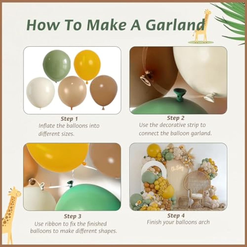 Create a stunning and elegant party atmosphere with this Sage Green and Mustard Yellow Balloon Garland Arch Kit, featuring a beautiful blend of 32 sage green, 32 mustard yellow, 30 sand white, 25 nude, and 25 coffee brown balloons. Designed for versatility, this kit includes essential accessories such as strip tape and glue points, making assembly effortless. Crafted from high-quality latex, these durable and thick balloons maintain their shape for several days when tied properly. Perfect for baby showers, birthdays, gender reveals, safari and jungle-themed parties, or any special celebration, this balloon garland adds a stylish touch to your décor. Easy to assemble with included tools, it creates a breathtaking backdrop for memorable photos and unforgettable moments. For best results, avoid overfilling and keep away from excessive heat, sharp objects, or friction to ensure long-lasting beauty.