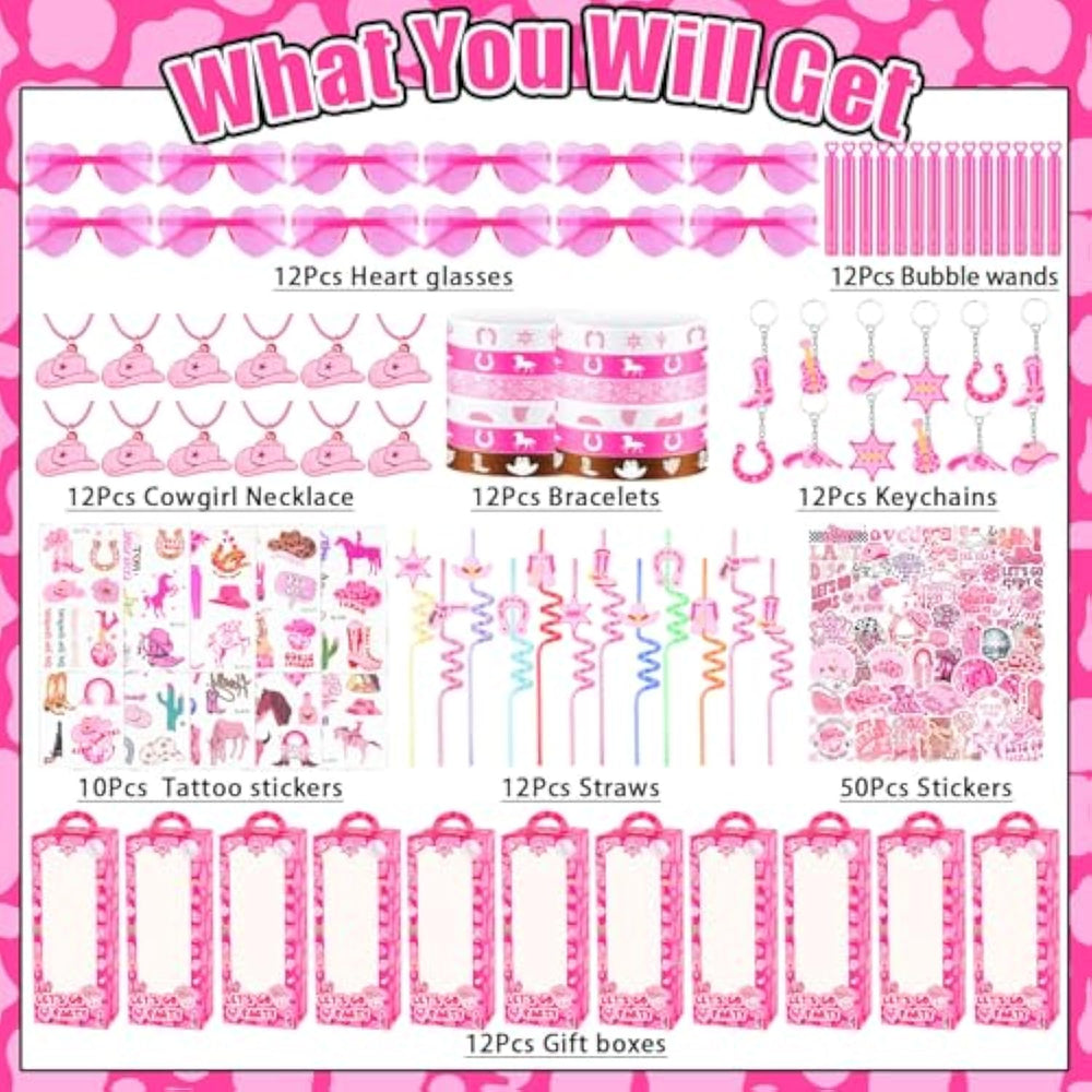 | ?Value 145 Party Gift Pack?You’Ll Receive 145 Pink-Themed Party Gift Sets—Loaded With 12 Heart-Shaped Glasses, Straws, Silicone Bracelets, Cowgirl Necklaces, Keychains, And Bubble Wands Each; Plus 10 Cowgirl Tattoos, 12 Cute Cowgirl Gift Boxes, And 50 Cowgirl Stickers. This All-In-One Bundle Is Designed To Immerse Kids In A Vibrant Cowgirl Role-Play Experience, Whether For Birthday Bashes, Classroom Celebrations, Or Holiday Gatherings—Creating Lasting Memories They’Ll Cherish! | | ?Versatile Ideal Favors??This Pink Gift Set Suits 12-Person Birthday Parties, Ideal For Group Games Or Friendship Gifts. Perfect For Rodeo/Cowboy/Western/Girl Parties, Classroom Prizes, And Holidays Like Halloween/Thanksgiving/Christmas—It’S A Must-Have. Girls Of All Ages Love It, Making It A Cowgirl Party Hit! | | ?Innovative Design?This Pink Cowgirl-Themed Favors Gift Set Is A Massive Hit With Girls And Women, Featuring A "Western Cowgirl" Theme That Embodies The Spirit Of Bravery, Adventure, And Confidence. The Cowgirl-Themed Party Gift Boxes Are Especially Charming, Serving As The Perfect Storage Solution For These Goodies. With A Clear Front Window, They Beautifully Showcase The Contents—Ideal For Sharing With Friends And Spreading The Joy. A Carnival Essential, Don’T Miss Out! | | ?Trustworthy Quality?Safety And Comfort Are Our Top Priorities For Favors Toys! Every Toy Has Undergone Rigorous Testing. From Food-Grade Material Straws To Skin-Friendly Silicone Bracelets, Necklaces, And Gentle Bubble Solution, Every Detail Is Thoughtfully Designed! With Plenty Of Cowgirl-Inspired Decorations, Girls Can Unleash Their Creativity And Shine At Any Party! | | ?Worry Free After-Sales Service??We Are Committed To Delivering High-Quality Products And Services. If You Have Any Questions About Our Western Cowgirl Party, Please Feel Free To
