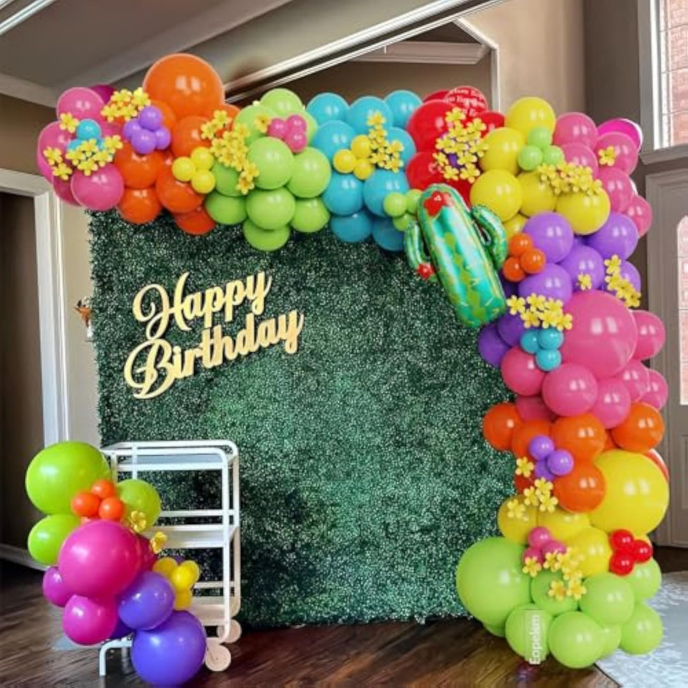 This Mexican fiesta party decoration set is perfect for themed celebrations, including taco parties, birthdays, retirements, store openings, and Cinco de Mayo events. The kit includes 144 multicolor latex balloons in various sizes, a llama foil balloon, a cactus foil balloon, a balloon arch, a roll of balloon ribbon, balloon dots, and more as shown in the package. Designed for easy assembly, the balloon garland can be inflated and displayed on trees, walls, windows, doorways, tables, or any desired location. Featuring a vibrant and festive color palette, this kit adds a lively touch to any event, making it an excellent choice for parties with limited budgets and preparation time.