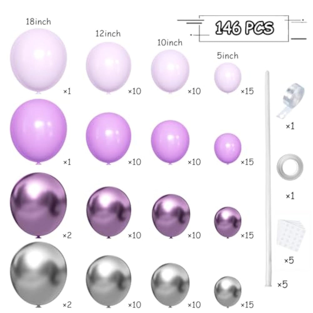The 146 Pcs Balloon Arch Kit includes chrome silver balloons, grey violet maca, and metallic purple balloons in various sizes (18" x 6, 12" x 40, 10" x 40, 5" x 60), white tube balloons (5 pcs), balloon chain tape (1 roll), glue dots (5 sheets), and balloon ribbon (1 roll). Made from skin-friendly natural latex, the balloons are non-toxic, odorless, and resistant to oxidation, maintaining their shape for 5-7 days. The kit is designed for easy assembly, allowing you to fill the balloons with air or helium and create a stunning garland with the included accessories. Perfect for a variety of occasions such as graduations, engagements, weddings, anniversaries, baby showers, corporate events, photo shoots, and more. Enjoy the fun and creativity of DIY while decorating your event.