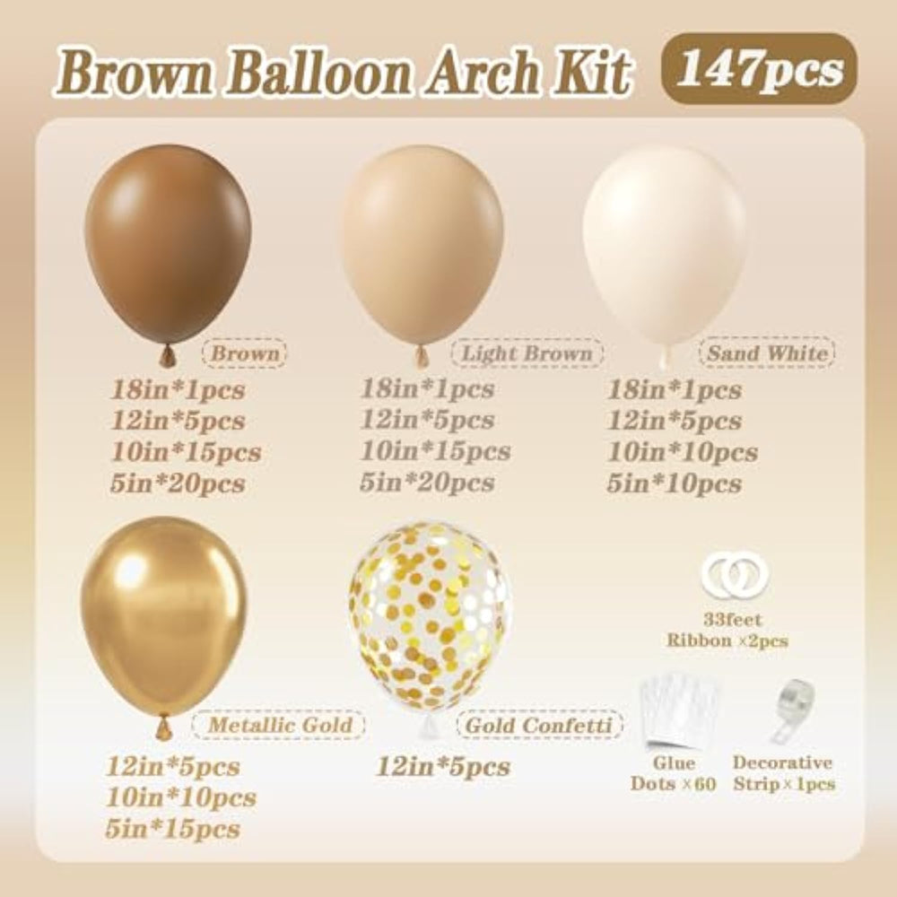 This 147-piece Brown Balloon Garland Kit includes a mix of brown, light brown, sand white, metallic gold, and gold confetti balloons in various sizes, along with ribbon, glue dots, and a decorative strip for easy setup. Made from high-quality latex, the balloons are durable and easy to inflate—just use a pump and avoid overinflating. With simple assembly instructions, you can quickly create a stunning balloon arch for any occasion. Perfect for boho baby showers, weddings, birthdays, anniversaries, or themed parties like “We Can Bearly Wait” or western-style celebrations.