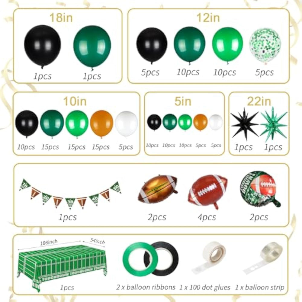 | Package Includes : Dark Green Black Brown Balloons Arch Kit Different Size Pack Contains 148Pcs In Total, 2Pcs Foil Star Foil Balloons(22”), 4Pcs Foil Football Balloons, 2Pcs Touch Down Balloons, 1Pcs Football Game Time Banner, 1Pcs Football Tablecloth, 4Pcs X 18Inch Balloons(Dark Green, Black), 30Pcs X 12Inch Balloons(Dark Green, Green, Black,Green Confetti), 60Pcs X 10Inch Balloons (Black, Dark Green, Green, Brown,White), 40Pcs X 5Inch Balloons(Black, Dark Green, Green, Brown, 5Pcs White), 4Pcs Balloon Tools. | | Time-Saving Party Decor : Our Football Garland Kit Is Easy To Set Up And Hassle - Free. Equipped With All The Tools You Need (Balloon Ribbons, Balloon Strip, And Balloon Dot Glues), So Just Take Few Simple Steps To Assemble.First, Inflate 18 12 10Inch Balloons,Stuff The Knot Into The Hole Of The Balloon Chain. Then, Tape It To The Wall Or Use Ribbon To Hang It On A Party Backdrop,Stick 5Inch Balloons And Star Balloons On The Gaps Of The Balloon Garland. Finally, Set The Decorative Accessories On The Proper Position. | | Premium Quality : The Foil Balloons Are Made Of Quality Aluminum Foil Material, Self-Sealing And Odorless, Well Printed And Not Easy To Fade. All The Latex Balloons Are Made Of Natural Latex, Safe And Non-Toxic, Sturdy And Durable. The Tablecloth Is Made Of Thick And Durable Pe Plastic Material Which Is Waterproof And Oil-Proof . The Football Banner Is Made Of Paper, Which Is Pre-Strung That Will Save You The Hassle Of Assembly. | | Widely Application: The Football Birthday Party Decorations Can Be Exquisite Ornaments To Add An Active Atmosphere, Intended For Football Baby Shower Decorations, Children'S Parties, Graduation Or Gender Revealing Football Birthday Decorations. | | Warm Tips : In Order To Keep The Perfect Shape Of The Balloons, Please Don’T Overfill It.