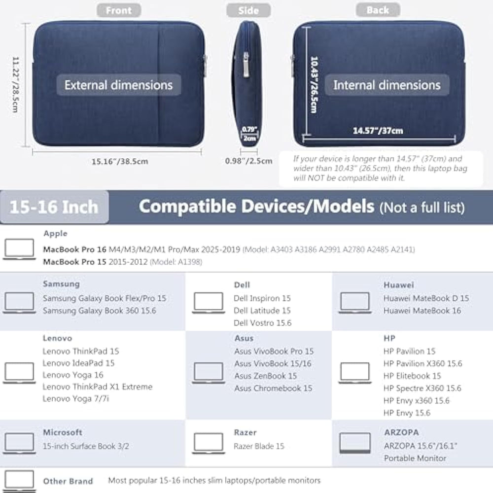 | Internal Dimensions: 14.57" X 10.43" X 0.79". Compatible With Macbook Pro 16 M4/M3/M2/M1 Pro/Max 2025-2019 (A3186 A3403 A2991 A2780 A2485 A2141), Macbook Pro 15 2015-2012 (A1398), Hp Pavilion/Elitebook/Envy 15, Hp Pavilion/Spectre/Envy X360 15.6, 15" Surface Book, Dell Xps 16, Dell Inspiron/Latitude/Precision/Vostro 15, Samsung Galaxy Book Flex/Pro 15, Asus Zenbook/Vivobook Pro 15, Lenovo Ideapad/Thinkpad 15, Yoga/Thinkbook 16, Vivobook 15/16, Arzopa 15.6"/16.1" Portable Monitor, Etc. | | 360° Multi-Layer Superior Protection: The Outer Fabric Is Made Of 900D Polyester Fabric, Which Is Water-Resistant, Scratch-Resistant And Wear-Resistant. The Middle Layer Is Padded With 8Mm Thickness To Absorb Bumps And Shocks. The Soft Velvet Lining Protects Your Laptop From Scratches When You Take Your Laptop Out/In. There Is Also A 2Cm Wide Protective Ridge All Around. As A Result, Your Laptop Is Always Tightly Wrapped And Protected With 360° Multiple Protection | | Larger Capacity Accessory Bag: Upgraded Pouch With More Space And Better Quality. Its Dimensions: 7.28 X 4.33 X 1.77 Inches (18.5 X 11 X 4.5 Cm), Which Is Roomy Enough Keep Your On-The-Go Accessories In One Place. It Has 2 Interior Mesh Divider Pockets That Allow You To Store Smaller Accessories Separately For Quick Access. The Lining Is Made Of Soft Fleece, Which Provides Better Protection For Your Items. Side Carry Handle Provides Convenient Carrying Options: Handheld Or Hanging From The Wrist | | Excellence In Details: An Additional Zippered Pocket On The Front Side Of The Bag To Hold Your Slightly Larger Carry-On Items Such As A Notebook, Etc. All Zippers Slide Smoothly And Won'T Get Stuck. The Metal Zipper Puller Is Thickened For Strength And Durability, Ensuring That This Laptop Bag Can Be Used Safely For A Long Period Of Time. This Laptop Bag Is Available In 14 Colors, So You Can Select A Perfect Color According To Your Personality/Favorite | | Slim And Lightweight: External Dimensions: 15.16" X 11.22" X 0.98" (38.5 X 28.5 X 2.5 Cm). Can Be Easily Carried In A Briefcase/Backpack/Traveling Case. Worry-Free : You'Ll Get A 12-Month Worry-Free . During This Period, If There Is Any Quality Problem With Your Laptop Bag, Please Feel Free To
