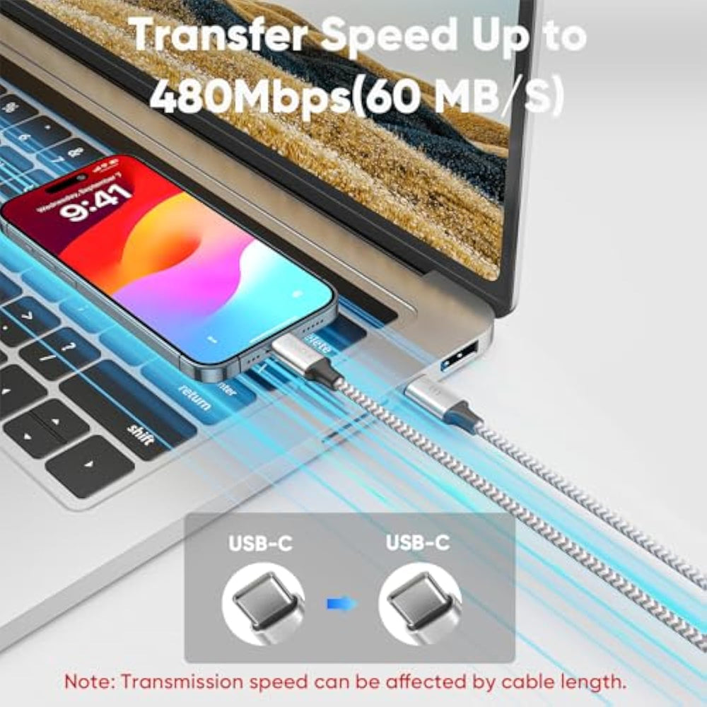 | 15Ft Ultra-Long Length: This Usbc To Usbc 15Ft (4.5M) Length Offers Unparalleled Flexibility For Extended-Distance Scenarios. Perfect For Home, Bedroom, Or Outdoor Charging Setups, It Frees You From Proximity Constraints While Powering Devices. | | 40W Rapid Charging: This 15Ft Usb C Cable Delivers 40W Fast Charging For Devices Like Iphone 15/16, Galaxy S/Ultra Series, Google Pixel, Macbook Pro/Air, And Ipad Pro/Mini. Optimized For Efficiency, It Cuts Charging Time By Up To 50% Compared To Standard Cables. | | 480Mbps Data Transfer: This Type C Cable Supports 480Mbps Transfer Speeds—Ideal For Connecting Peripherals (Keyboards, Mice) Or Transferring Files/Music Between Devices. Its Extended Length Ensures Clutter-Free Workspace Organization. | | Exquisite And Compact Design : Featuring A Durable Silver Nylon Braided Protective Rope And A Silver Compact Aluminum Case Design. Long Usb C Cord Is Specifi