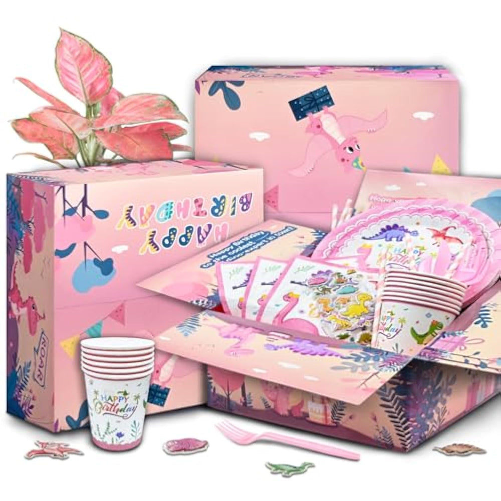 This 150-piece Pink Dinosaur Party Kit includes 50 colorful balloons, a "HAPPY BIRTHDAY" pink foil balloon, six dinosaur-shaped foil balloons, dinosaur-printed balloons, pink foil confetti curtains, dinosaur stickers, a large tablecloth, and 12 sets of themed tableware (plates, cups, utensils, straws). Made from safe, reusable materials, the kit is perfect for dinosaur-themed birthdays or baby showers. With easy-to-use installation tools like glue dots, balloon chains, and ribbons, setup is quick and stress-free. Ideal for boys, girls, and little dino fans, this kit adds a fun, unique touch to any celebration.