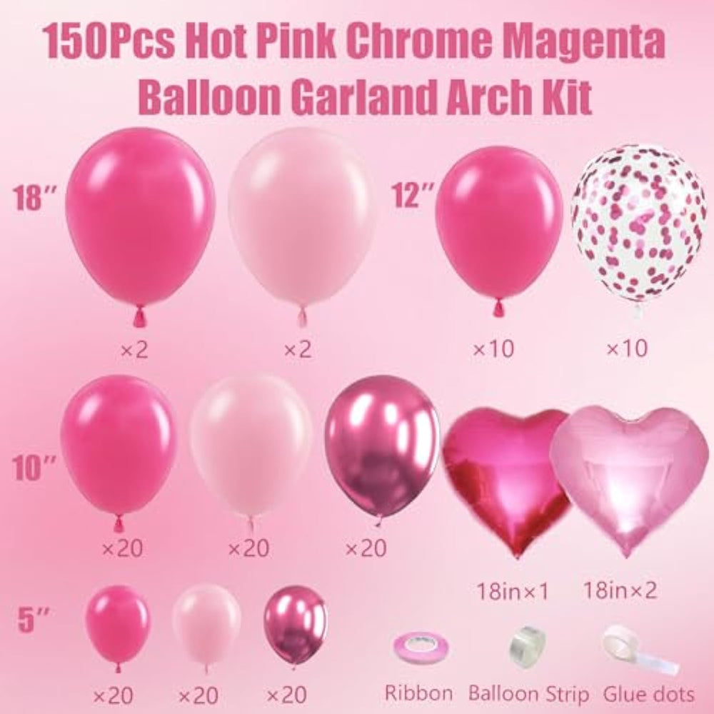 This 150-piece hot pink and magenta balloon garland kit is perfect for birthdays, baby showers, weddings, and other celebrations, adding a fun and elegant touch to any event. The set includes a mix of hot pink, baby pink, metallic magenta, and pink confetti balloons in various sizes, along with heart-shaped foil balloons, glue dots, a decorating strip, and ribbon. Made from high-quality materials, these balloons are designed for long-lasting use. Inflate with air or helium, and for confetti balloons, add a bit of water before inflating to help confetti stick inside.