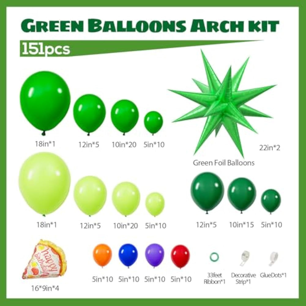 The green balloon arch kit includes 36 green balloons in various sizes, 30 dark green balloons, 36 lime green balloons, plus 5-inch red, orange, purple, and royal blue balloons, along with pizza and foil balloons. It also comes with a dark green ribbon, decorative strip, and glue dots for easy assembly. Made from high-quality latex, these balloons are durable and easy to inflate. Use a hand pump to quickly inflate them, avoiding overinflation for the best shape. Simply create balloon clusters, insert knots into the decorative strip, and attach with glue dots to complete a stunning balloon arch for any party backdrop.
