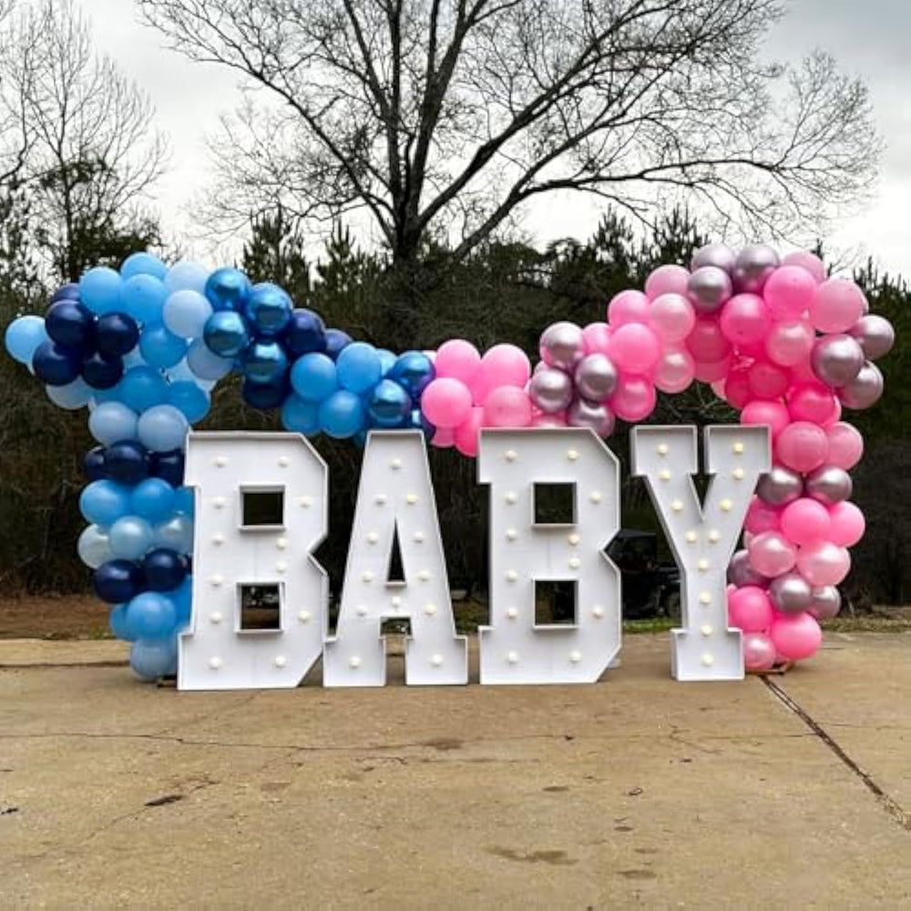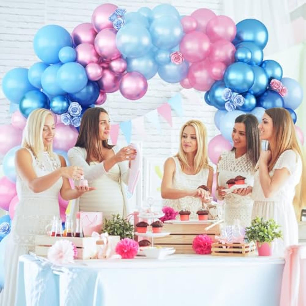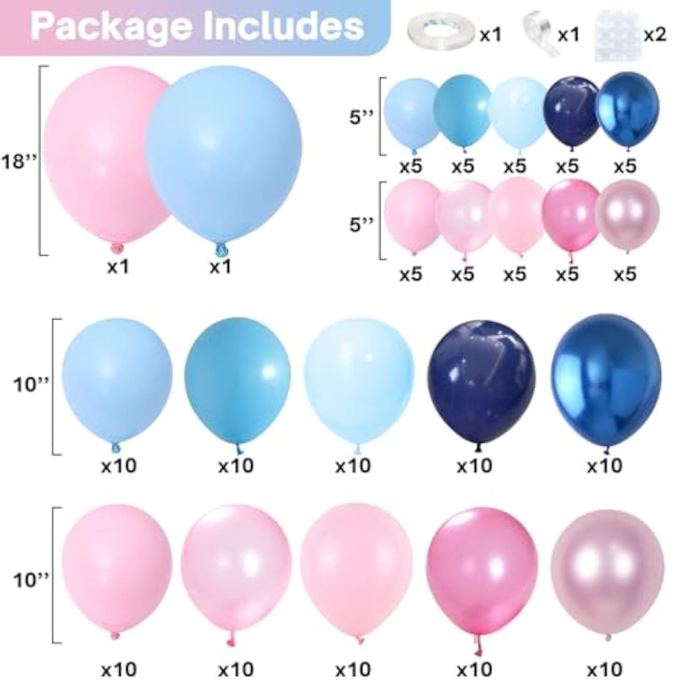 This 152-piece Pink and Blue Balloon Garland Kit includes a mix of 18", 10", and 5" balloons, along with a decorating strip, glue dots, and ribbon for easy setup. Made from high-quality, non-toxic, eco-friendly latex, the balloons are safe and durable for any event. They can be inflated with air or helium (helium recommended only for balloons 10" or larger). Ideal for gender reveals, baby showers, birthdays, weddings, and more, this versatile kit adds a fun, festive touch to any celebration.