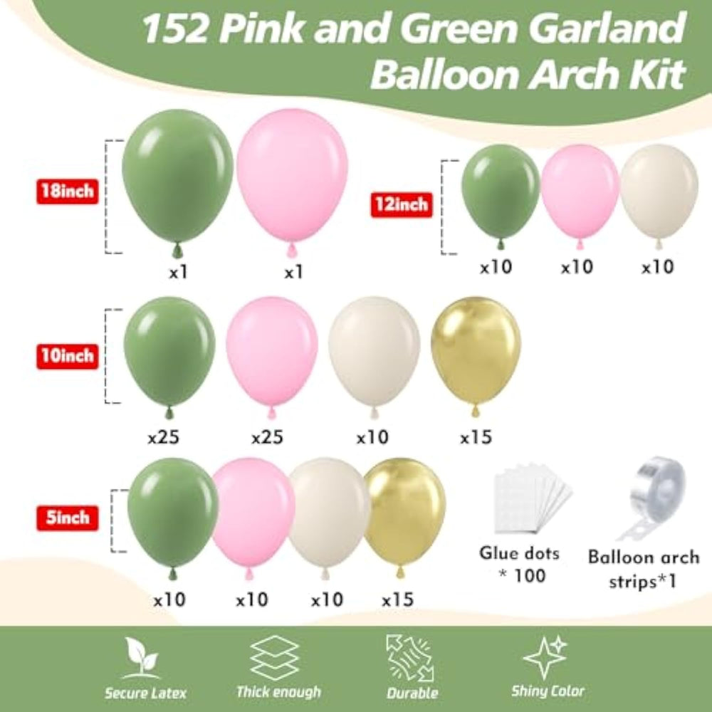Add a touch of elegance to your event with our Pink and Green Balloon Arch Kit, featuring 152 balloons in sage green, pink, white sand, and metallic gold across various sizes, plus glue dots and a balloon strip for effortless setup. Made from eco-friendly, durable latex, these balloons are safe for kids and suitable for air or helium inflation. Perfect for baby showers, weddings, birthdays, graduations, and jungle or woodland-themed parties, this kit brings charm to any celebration. With simple assembly tools included, creating a stunning balloon garland is quick and easy.