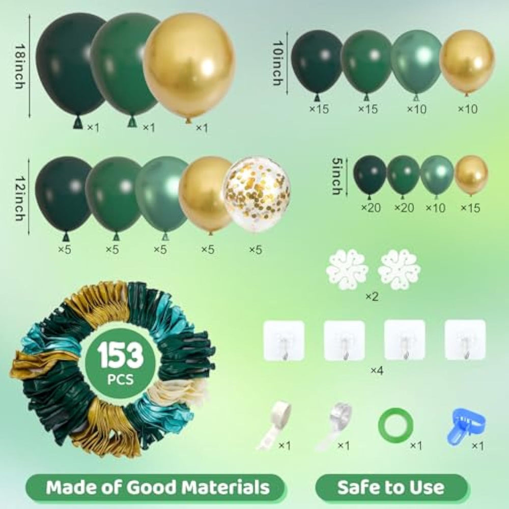 | Sufficient Quantity Of Green And Gold Balloons: Green Balloon Garland Includes 18 In Dark Green/Retro Dark Green/Metallic Gold Balloons(3 Pcs),12 In Confetti/Dark Green/Retro Dark Green/Metallic Green/Metallic Gold Balloons(25 Pcs), 10 In Dark Green/Retro Dark Green/Metallic Green/Metallic Gold Balloons(50 Pcs), 5 In Dark Green/ Retro Dark Green/Metallic Green/Metallic Gold Balloons(65 Pcs) And 10 Pcs Balloon Tools(Balloon Arch Strip, Tying Tool, Glue Points, Ribbon, Flower Balloon Clip, Hooks) | | Premium Quality Graduation Balloons: We Take Great Pride In The Quality Of Our Green And Gold Decorations, Which Have Undergone Rigorous Testing To Ensure Their Safety For Children; Our Green And Gold Balloons Are Made Of Great Quality Latex That Is Easy To Inflate And Safe For Kids To Use; The Green Balloons Are Also Decent, Flexible, And Not Easily Broken; Come And Enjoy A Happy Party With Green And Gold Balloon Arch Kit | | Used In Various Occasions: Our Green And Gold Balloon Arch Is Good Choice For All Kinds Of Parties And Special Occasions; Whether You'Re Hosting A Birthday, Baby Shower, Graduation Decorations, Hawaii, Aloha, Wedding, Tropical Party, Jungle, Safari Event, St. Patrick'S Day Decorations, Our Green Birthday Decorations Bring A Delightful And Charming Touch; You Can Hang Them On Trees, Walls, Windows, Doorways, Dining Tables And Anywhere You Like; Come To Organize An Unforgettable Party | | Easy To Use: Our Graduation Party Decorations Comes With Balloon Accessories Which Can Help You Create The Green Balloon Arch; Design Your Green And Gold Balloon Arch By Inflating The St Patricks Day Balloons With Helium Or Air, Then Attach Them With Balloon Strip Or Ribbon; And You Also Can Use Glue Dots To Add Small Balloons To The Garland, Allowing You To Mix And Match Different Sizes And Colors For Endless Styles | | Notes: Choking Hazard! Your Safety Matters Most; Please Use Our Green And Gold Party Decorations Cautiously; Parental Supervision Is Crucial For Children Under 12 Due To Choking Hazards; Dispose Of Damaged Green Balloons Promptly To Prevent Injuries; Keep Green Balloons Away From Heat, Wind, And Sharp Objects; Get Ready For A Magical Celebration With Graduation Balloons Different Sizes | |