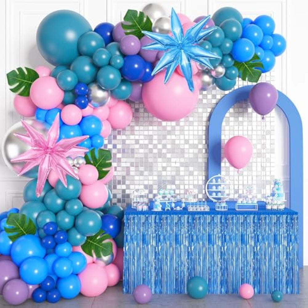 | Blue Balloon Arch Kit: Package Includes 1 Pcs Blue Table Skirt, 6 Pcs Palm Leaves, 2 Pcs Blue, Pink Foil Star Balloons, 3 Pcs 18" Teal Blue/Metallic Silver/Pink Balloons, 20 Pcs 12" Teal Blue/Dark Blue/Pink And Blue Balloons, 51 Pcs 10" Purple/Pink/Teal Blue/Dark Blue/Metallic Silver/Blue Balloons, 70 Pcs 5" Blue/Purple/Teal Blue/Dark Blue/Metallic Silver/Pink Balloons, 4 Pcs Balloon Tools | | Widely Applications: Featuring A Stunning Pink And Blue Balloons, Metallic Silver And Purple Balloons; Decent For Kids Girls Birthday Party, Hawaii Party Decorations, Tropical Party Decorations, Baby Shower Decorations, Cartoon Party, Gender Reveal Decorations, Video Gaming Party And Summer Party Decorations | | Colorful Combinations: Our Blue Balloon Garland Is Brightly Colored, And Pink And Blue Balloons Add Fun To Holiday Parties; The Metallic Silver Accents And Colorful Balloons Make It A Standout Piece For Any Party Supplies | | Easy Assembly: Everything You Need Is In This Blue Balloon Arch Kit For Hassle-Free Assembly; Balloon Arch Strip And Ribbon Are Included; Enjoy Diy Creative Blue Balloon Arch Kit With Family And Friends, Unforgettable For Any Celebration | | Warm Tips: Please Note That Ensure Your Blue And Pink Balloons Look Decent, Inflate The Balloon To Approximately 85% Capacity To Prevent Bursting; Keep The Blue Balloon Arch Kit Away From Sharp Objects And Direct Sunlight To Maintain Its Appearance | |