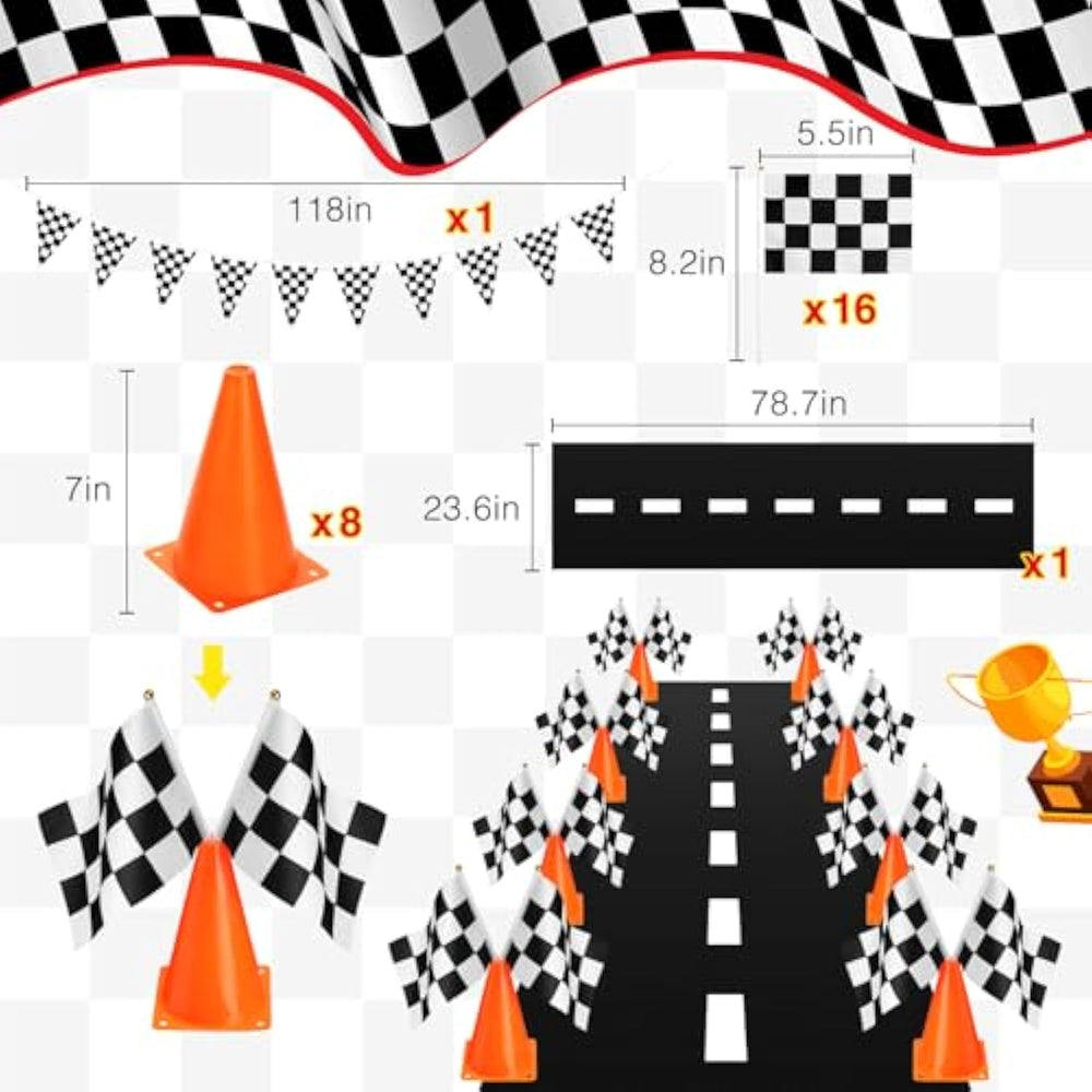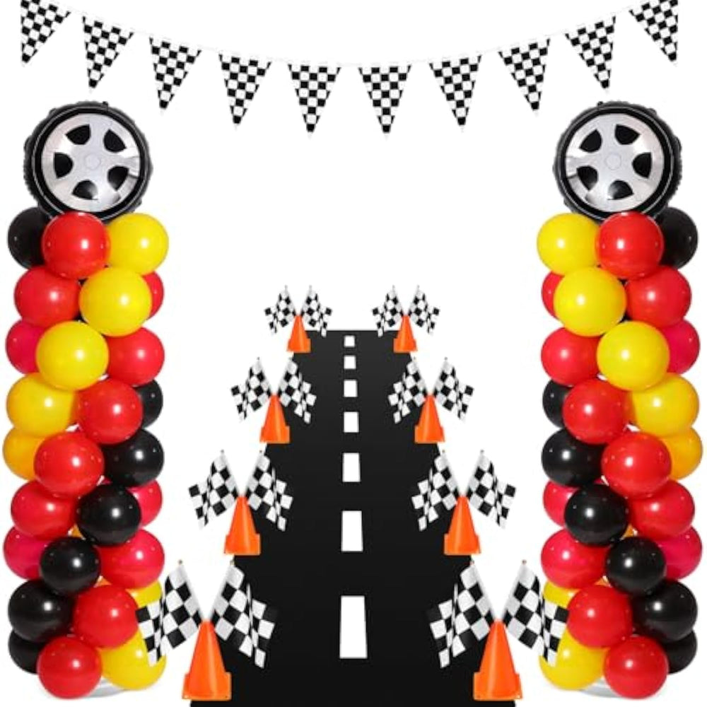 | Race Car Balloon Set: 159 Pcs, Including A Complete Set Of Racing Elements; Include Two 18 Inch Tire Balloons; Red, Black And Yellow 10 Inch Latex Balloons Are 30 Each; In Addition, It Is Equipped With 30 Balloon Buckles, 2 Balloon Brackets, 2 Plastic Bases, 2 Water Bag Bases, 2 Base Adapters , 2 Telescopic Bracket, 1 Glue Point, 1 Racing Track Floor Slide, 8 Traffic Cones With Holes, 16 Checkered Flags, 1 Black And White Checkered String Flag; They Deliver A Real Racing Experience Right | | Racing Atmosphere: The Latex Balloons In The Set Are Race Themed; The Red, Black And Yellow Balloons Are Brightly Colored And Can Be Integrated With Elements Such As Race Themed Track Cloth, Traffic Cones, Black And White Checkered Flags And Hand Waved Flags, Instantly Lighting Up The Enthusiastic Atmosphere Of The Party | | Easy Install No Need Tools: Installs In Just 1 Minute; Compared With Other Balloon Tower Stands, Our Balloon Column Has No Multiple Splicing Steps; The Stainless Steel Telescopic Pole Structure Is Convenient To Use, Sturdy And Not Easily Deformed; With A Reduced Size Of 45 Centimeters, Lightweight And Space Saving, The Balloon Column Can Be Adjusted From 1.47 Ft To 6.56 Ft, To Meet Your Different Needs For Different Occasions | | Safe And Reliable: The Racing Balloon Set Is Made Of Aluminum Foil And Latex, Which Is Thick Enough Not To Fade Or Break, Can Be Applied For A Long Time, And Can Be Reused Again; It'S Easy To Inflate These Balloons, Whether You Inflate Them With Air Or Helium, They Are Easy To Bring Fun To Your Next Event, Just Don'T Over Inflate | | Widely Applicable: Whether It Is A Birthday Party, Anniversary Celebration, Theme Party Or All Kinds Of Events, Or Even Agile Training, This Racing Theme Decoration Set Can Be Good; The Relaxed Racing Atmosphere Is Sure To Immerse Everyone In The Party; Whether It Is Indoor Or Outdoor, It Can Show The Unique Charm Of Racing | |
