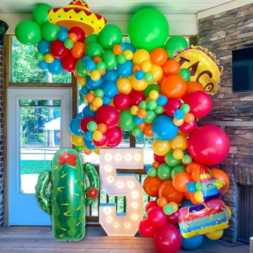 Bring vibrant energy to your celebration with this 159-piece Mexican Fiesta Balloon Garland Kit, perfect for birthdays, baby showers, and Cinco de Mayo parties. The set includes 153 colorful latex balloons and 4 fun foil balloons featuring a cactus, llama, sombrero, and taco. Made from high-quality latex, the balloons are durable, stretch well, and can be filled with air or helium. Easy to assemble and ideal for DIY setups, you can hang them on walls, windows, or doorways for a festive backdrop. This all-in-one kit offers great value and eye-catching decor for any fiesta-themed event.
