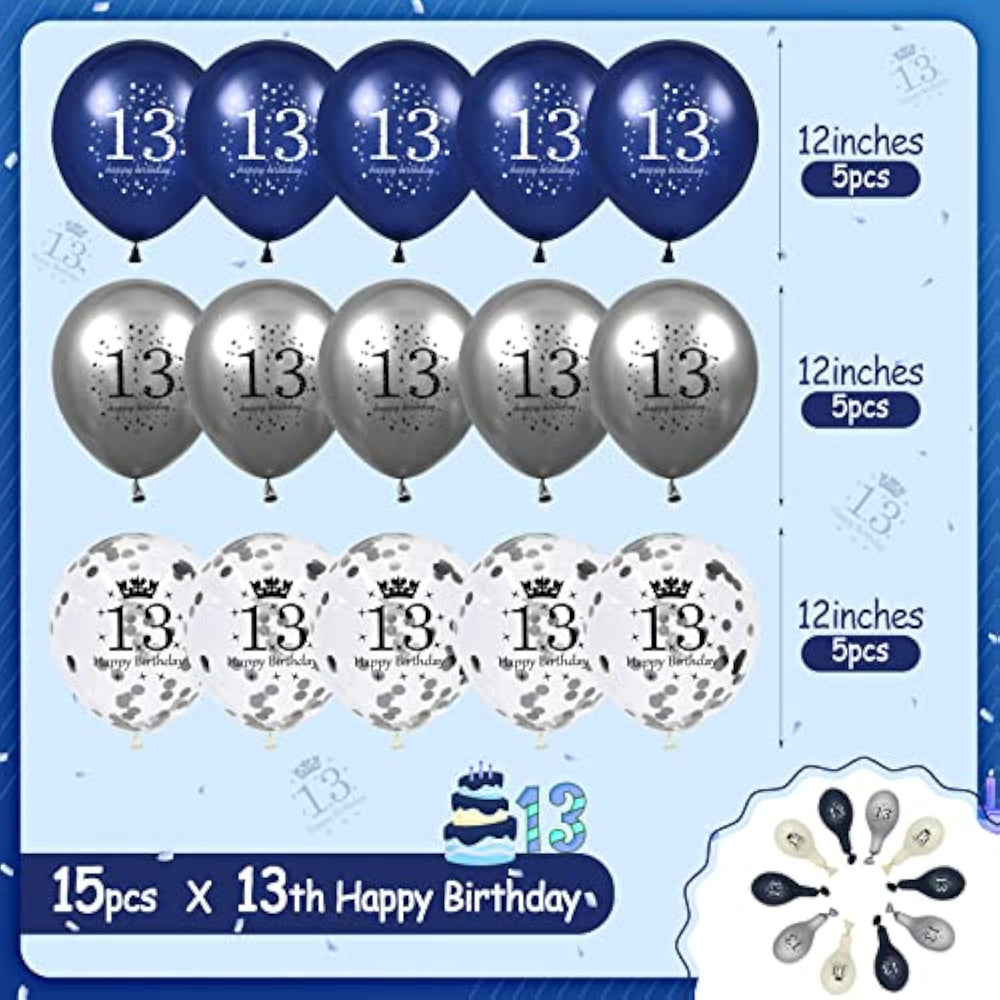 Celebrate a special milestone with this 15-piece set of navy blue and silver 13th birthday balloons, each featuring a “Happy 13th Birthday” design. Made from durable latex, these 12-inch balloons can be filled with air or helium and are perfect for boys' or girls' birthday celebrations. The confetti balloons add extra sparkle—just rub them to help the confetti stick to the sides. Ideal for decorating walls, tables, yards, or cars, this versatile set adds a festive touch to any 13th birthday or anniversary party.