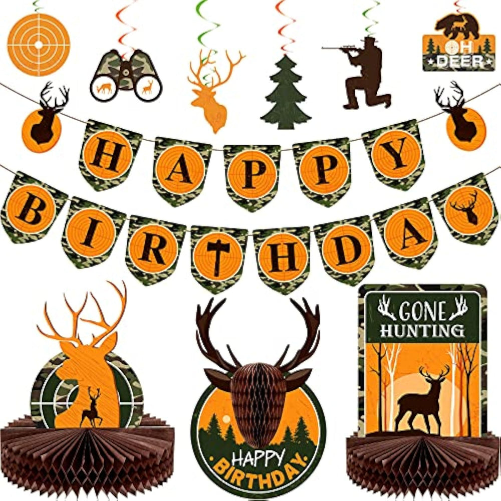 Paper | Package Includes: You Will Receive 1 Piece Birthday Banner, 6 Pieces Swirls, 6 Pieces Swirls Hanging Cards, 3 Pieces Honeycomb Table Decor, There Are 16 Pieces Of Decorations In Total, A Sufficient Quantity Is Enough To Meet Your Party Decorations Needs, These Accessories That Match The Theme Of The Party Are Carefully Picked For You, Hope You Can Make Full Use Of Them | Cool Design: These Decorations Feature Shapes Of Deer, Bears, And Trees, Appealing To Hunting Enthusiasts. Their Vibrant Designs Can Make Your Party Cheerful And Engaging. | Reliable Material: The Hanging Swirls Are Made From Quality Flashing Pvc, Spiral Ornaments Card Paper Are All Made Of Paper, While Desktop Decorations Are Made Of Durable Paper And The Color Is Not Easy To Fade, Can Be Folded And Stored After Use, Can Be Applied Repeatedly | Enjoy The Fun Of Diy Decoration: The Happy Birthday Banner Has Been Assembled For You In Advance, You Only Need To Assemble These Hanging Swirls And Table Decorations, And You Are Able To Easily Hang These Spirals With Other Themed Decorations On The Walls, Ceilings, Yards, Porches, Trees And Other Indoor As Well As Outdoor Places To Add Attraction To Your Party | Delightful Atmosphere: These Funny Decorations Are Suitable For Decorating Themed Party, Such As Birthday Parties, Friends Gatherings, Baby Showers, Etc.; They Can Also Be Applied As Delicate Photo Props, You Are Able To Stand In Front Of The Banner, Hold The Desktop Decors And Hold Your Posture, And Request Others To Take Some Lovely Photos For You, Enjoy This Joyous Time, Because It May Become An Unforgettable Memory For You |