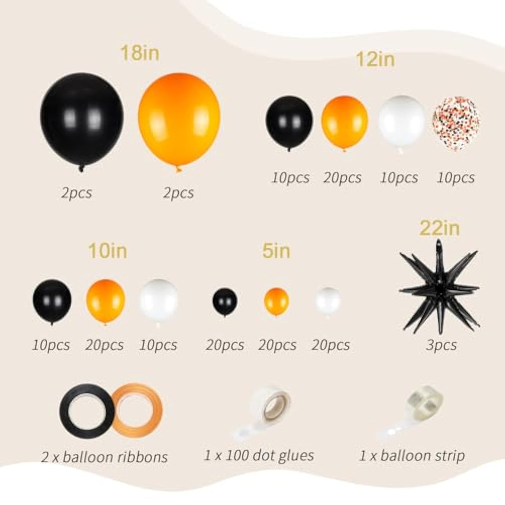 This Halloween balloon arch kit includes 161 pieces, featuring black, orange, and white balloons, three black starburst foil balloons, confetti balloons, and four balloon tools to help with assembly. Made from high-quality biodegradable latex, the balloons are safe, durable, and resistant to bursting, and can be filled with either air or helium. With the included ribbons, dot glue, and balloon strip, it’s easy to create custom garlands, arches, or creative shapes to match your party theme. Ideal for Halloween, Thanksgiving, baby showers, birthdays, weddings, and other festive occasions, the vibrant color combination adds a fun and celebratory touch to any event. For best results, avoid over-inflating, and use a balloon pump to maintain the perfect shape.