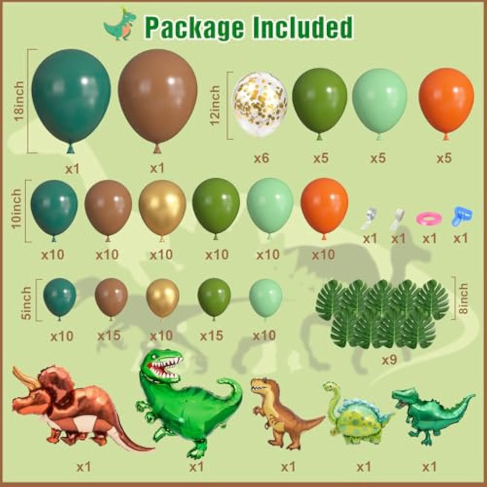 | Dinosaur Balloon Arch: Includes 2Pcs 18In Balloons(Dark Green/Brown), 21Pcs 12In Balloons(Confetti/Olive/Green/Orange), 120Pcs 10/5In Balloons(Dark Green/Olive/Green/Brown/Orange/Gold), 5Pcs Different Foil Dinosaur Balloons, 8Pcs Leaves, 4Pcs Accessories | | Versatility Decorations: From Dinosaur Party Decorations, Jungle Safari Baby Shower, Or A Dinosaur-Themed Event, This Versatile Dino Birthday Decorations Set Adds A Playful Touch To Any Occasion, Making It Suitable For Both Indoor And Outdoor Celebrations | | Premium Quality: Our Dino Balloons Are Made From Natural Latex, Which Are Thick. These Dinosaur Birthday Balloons Contain Various Balloon Sizes, Including 18/12/10/5Inch Dinosaur Balloons, Allowing You To Create A Dynamic Jungle Balloon Arch | | Effortless Assembly: These Green And Brown Balloons Are Also Includes 4Pcs Balloon Accessories For Easy Assembly. Whether You'Re A Seasoned Party Decorator Or A Novice, Our Dinosaur Balloon Garland Kit Is Suitable For Everyone | | Comprehensive Party Package: This All-Inclusive Dinosaur Balloon Arch Includes An Impressive Variety Of Balloons, Including Eye-Catching Foil Dinosaur Balloons And Palm Leaves, Ensuring You Have Everything Needed To Create An Unforgettable Décor | |