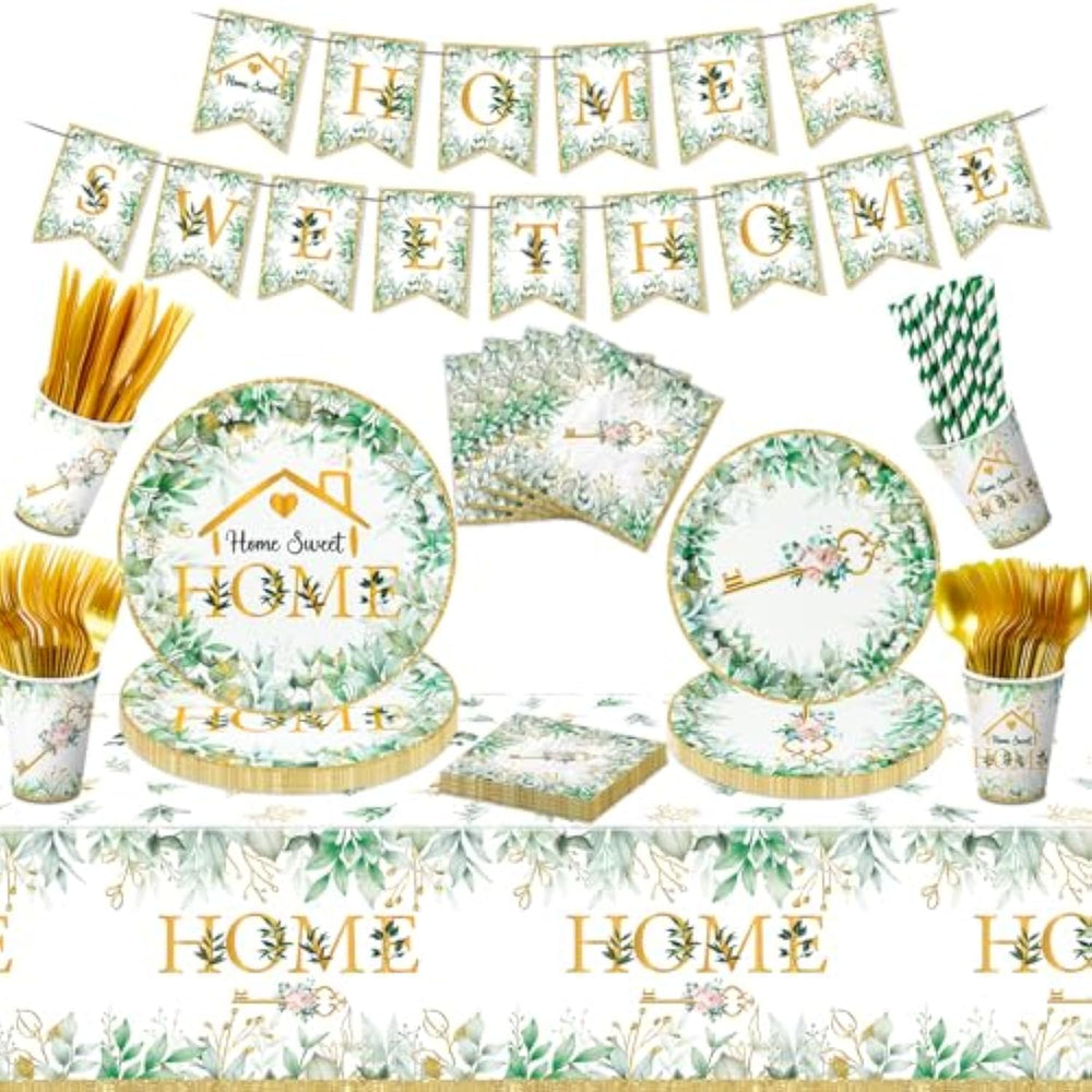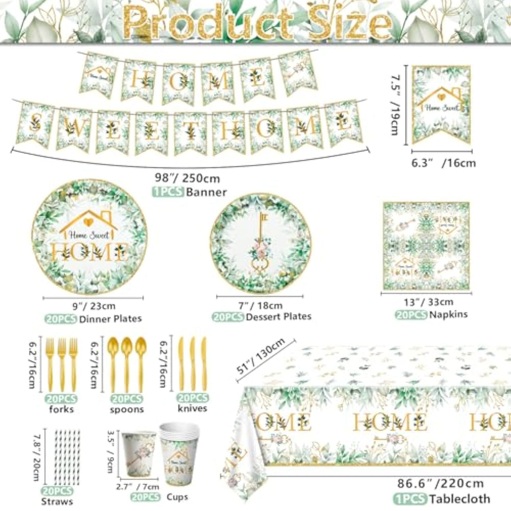 | Value Package - The Housewarming Decorations Pack Includes 20 X Dinner Plates, 20 X Dessert Plates, 20 X Sweet Home Napkins, 20 X Cups, 20 X Paper Straws, 20 X Knives/Forks/Spoons, 1 X Home Sweet Banner, And 1 X Home Tablecloth, This All-In-One Party Supply Set Includes Everything You Need To Create A Magical Housewarming-Themed Celebration. | | Rustic And Elegant Design - The Decorations Feature A Rustic And Elegant Design, Printed With Cute Patterns Such As Flowers, Keys, House, And The Words “Home Sweet Home”, Adding A Warm And Welcoming Atmosphere To The New Home. | | High Quality - Cups/Straws/Banners/House Plates/Napkins Party Supplies Are Made Of Thick Paper, Lightweight, And Safe. Housewarming Tablecloths Are Made Of Quality Pe, Waterproof And Stain-Resistant. | | Save Your Time - The Sweet Home Party Decor Pack Needs No Washing Up, You Can Throw Them Away After Using, Allowing You To Enjoy More Party Time! | | Versatile Decoration - Suitable For A Wide Range Of Events, Including Housewarming Parties, Home Sweet Parties, New House Parties, Bridal Showers, Baby Showers, Baptism And Birthday Parties, Flower Theme Parties, Summer Parties, Family Gatherings, Barbecue Parties, And More. | |