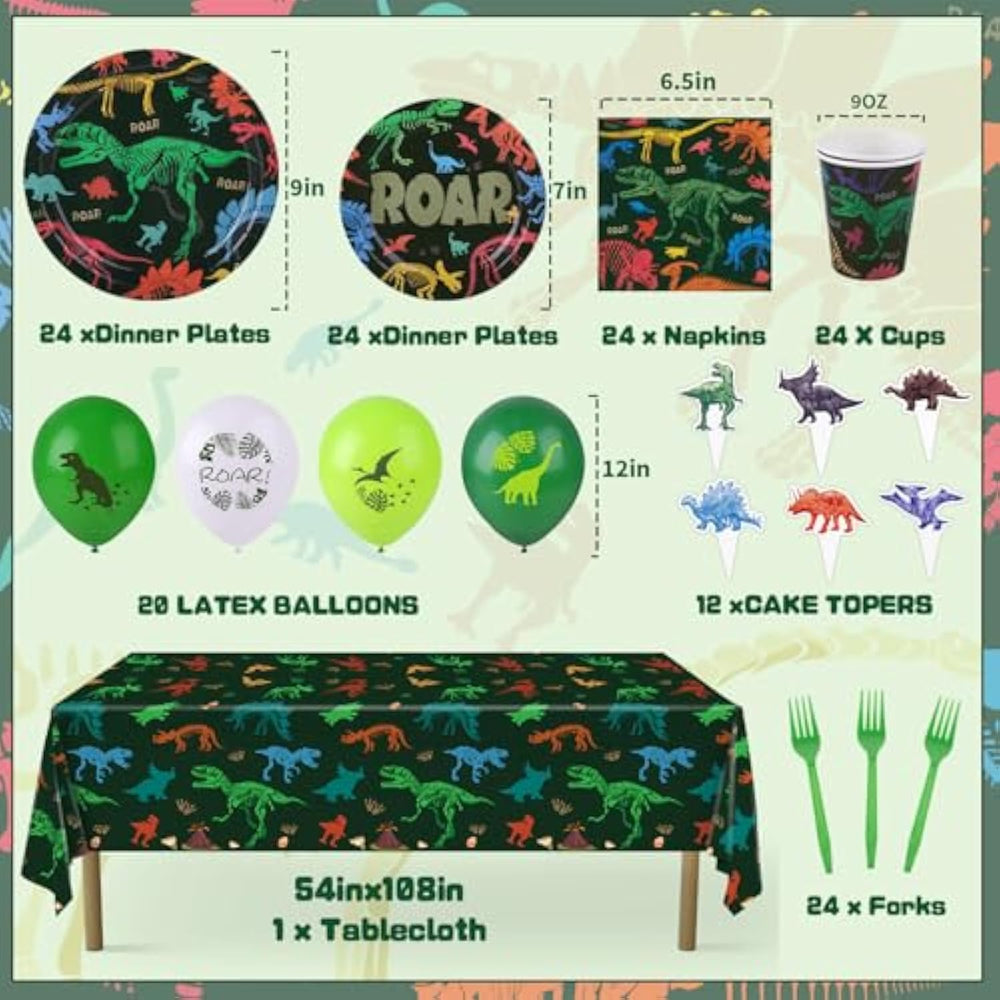| Dinosaur Birthday Decorations For Boys: Specially Designed Dinosaur Birthday Decorations, The Cute Realistic, Product Is Bright And Clear, T-Rex Design “ Happy Birthday” Banner Featured A Movable Hands, And Leg Which Will Your Birthday Party Fun. Make It Easy For You To Create The Most Unique Dinosaur Jungle Party With Your Family And Kids | | Super Value Pack: Our 164 Piece Dinosaur Party Supplies Kit Comes With Everything You Need. No Need To Spend Valuable Time And Money Looking Around For Different Birthday Party Decorations. You Will Receive A Vibrant Dinosaur Birthday Banner, 24 X 9 Inch Plates, 24 X 7 Inch Plates, 24 Napkins, 24 Forks, 24 Cups, 20 Balloons, 12 Cake Toppings, 8 Hanging Swirls, 2 Dinosaur Foil Balloons, And 1 Tablecloth. Enough Quantity And Plenty Of Style For Your Party Needs. Accommodates Up To 24 Guests | | High Quality: All Our Dinosaur Party Plates And Napkins Or Dinosaur Party Decorations Are Made Of High Quality Paper, Non-Toxic, Odor Free, Heat Resistant And Durable. The Forks Will Not Bend, Break. Bright Color, High-Grade Feeling, Our Dinosaur-Themed Plates Are Perfect For Holding Up Favorite Meals And Snacks. You Can Use These Party Supplies With Ease | | Widely Application: Dinosaur Birthday Party Supplies Kit Can Be Used To Make Beautiful Decorate For Parties Of Many Occasions And Centerpiece Anywhere You Want To Decorate! It Is Suitable For Jungle Theme Birthday Party, Dinosaur Birthday Party, Safari Birthday Decorations, Dinosaur Baby Shower Decorations, Kids Party, Wild One Birthday, Dino Party Decorations, Jurassic Park Decorations Etc. It Will Be A Perfect Dinosaur Party Decorations Background And Make Your Party Well Received | | We Are Always Ready To Help: We Are Very Confident In The Quality Of Our Dinosaur Birthday Party Supplies Because We Use High Quality Materials To Make Them, So You Can Buy With Confidence. We Are Committed To A Better Shopping Experience For Our