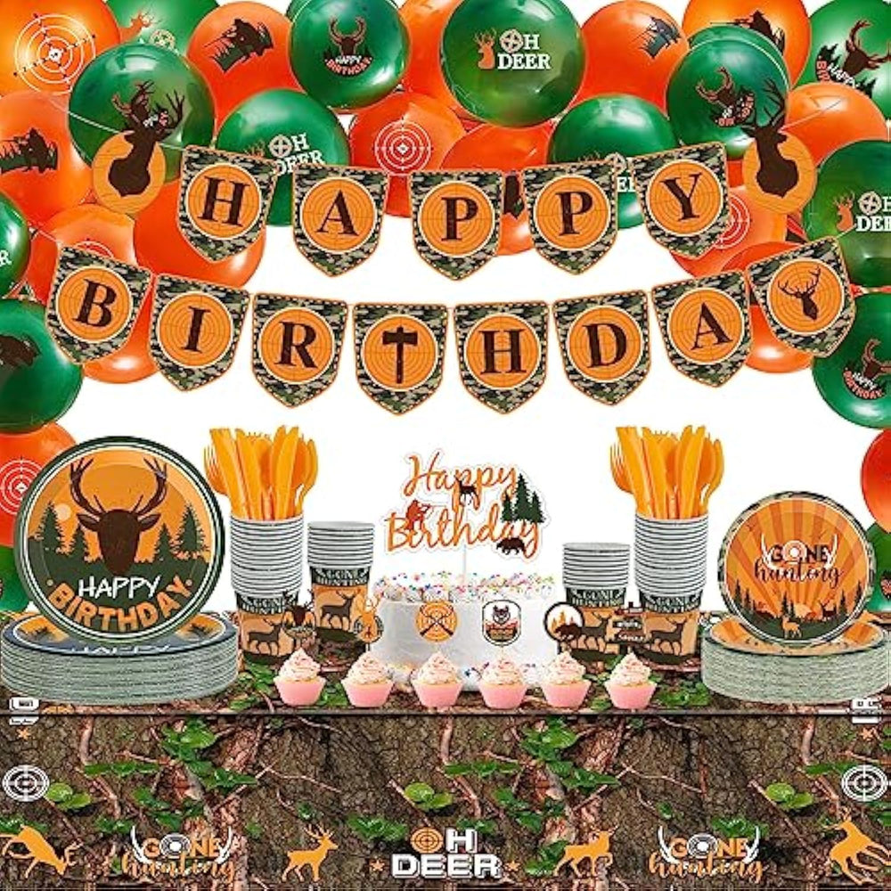 What You Can Get: You Will Get 1 Set Of Hunting Decoration, Including 1 Happy Birthday Banner, 18 Small Cake Topper And 1 Big Cake Topper, 1 Table Cloth, 32 Plates, 16 Cups, 16 Knives, 16 Spoons, 16 Forks And 48 Pieces Balloons In 4 Styles, Total Of 165 Pieces, The Nice Combination And Sufficient Quantities Can Support Your Decoration Needs | Hunting Themed Elements Design: These Camo Birthday Party Supplies Are Featured In Hunting Theme And Contain Various Representatives Such As Deer, Bear, Tree, Camouflage And So On; It Is Easy To Attract The Attention Of Boys And Girls Who Like Hunting Elements, They Will Be Interested In These Colorful Decorations, Which Can Make Your Party More Fun | Quality Material: Hunting Birthday Decorations Include Banner, Cake Toppers, Plates, Cups, These Are Mainly Made Of Quality Paper Material, And The Knives, Spoons, Forks, And Table Cloth Are Mainly Made Of Plastic, The Balloons Are Mainly Made Of Latex, Which Are Not Easy To Fade And Can Be Applied For A Long Time | Enjoy The Diy Time: The Birthday Banner Of Hunting Decors Is Pre Assembled Before, Matching Other Hunting Decors, To Attach Them On The Wall, Ceiling, Tree, Window, Balcony, Or In The Yard, Porch, Living Room, Classroom And Other Indoor Or Outdoor Places, Use These Cake Toppers To Decorate Cakes And Desserts, Adding Charms To Your Party | Applicable Occasions: These Camouflage Birthday Party Supplies Are Suitable For Decorating Hunting Themed Party, Such As Birthday Parties, Family Gatherings, Baby Showers, Gender Reveal Parties And So On |