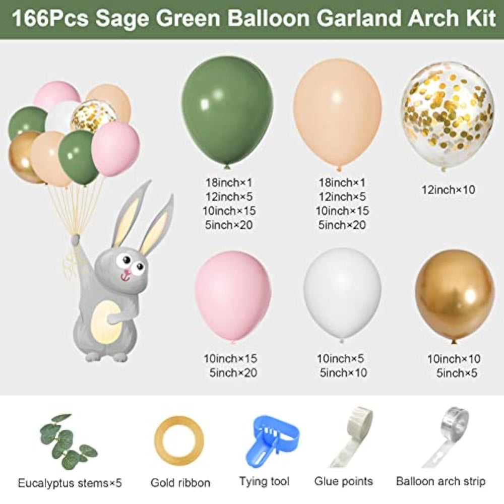 Sage Green Pink Balloon Garland Arch Kit: Sage Green Balloons(1 Pcs 18 Inches, 5 Pcs 12 Inches, 15 Pcs 10 Inches, 20 Pcs 5 Inches), Pastel Orange Balloons(1 Pcs 18 Inches, 5 Pcs 12 Inches, 15 Pcs 10 Inches, 20 Pcs 5 Inches), Gold Confetti Balloons(10 Pcs 12 Inches), Pink Balloons(15 Pcs 10 Inches, 20 Pcs 5 Inches), White Balloons(5 Pcs 10 Inches, 10 Pcs 5 Inches), Metallic Gold Balloons(10 Pcs 10 Inches, 5 Pcs 5 Inches), 5 Pcs Eucalyptus Stems, 1 Pcs 100 Glue Points, 1 Pcs Balloon Arch Strip, 1 Pcs Tying Tool And 1 Pcs Ribbon | Great Quality: All Balloons Of The Sage Green Balloon Garland Kit Are Made Of Foil Or Strong Latex, Each Balloon Has Been Strictly Tested And Selected Manually, Thick And Strong; Unlike Ordinary Balloons, The Balloons Of Sage Green Baby Shower Decorations Are More Plump In Color, Do Not Explode, And Can Support All Day Parties; Don'T Worry, And These Balloons Are Easy To Use During Baptism Decorations | Applications: This Sage Green Balloon Garland Kit Is Suitable For All Kinds Of Party Decorations, And It Will Create An Appointment Party Atmosphere For You; The Pink And Sage Green Party Decorations Is Suitable For Decorating Wedding, Birthday Party, Baby Shower, Home Decoration, Graduation Ceremony, Engagement Party, First Communion Decorations, Baptism Decorations Or Any Events | Easy To Assemble: The Sage Green Balloon Arch Kit Is Simple And Beautiful Decorations, And Use Our Balloon Tool To Help You Build A Sage Green Balloon Arch Quickly And Easily; This Is A Great Time To Spend With Your Family; Inflate All The Balloons With Them, And Then Assemble The Balloon Chain To Build Them Into The Shape You Like; And It Comes With An Artificial Eucalyptus Stems To Help You Decorate The Balloon Arches | Warning: Choking Hazard; These Balloons Of The Sage Green Party Decorations Can Be Filled With 80% Gas, And Store The Sage Green Balloon Arch Away From Direct Sunlight And Other Heat Sources, Or They Will Burst Easily; Children Under 12 Years Old May Choke Or Suffocate On Uninflated Or Broken Balloons; Parents Supervision Is Required; Keep Uninflated Balloons From Children; Discard Broken Balloons At Once |