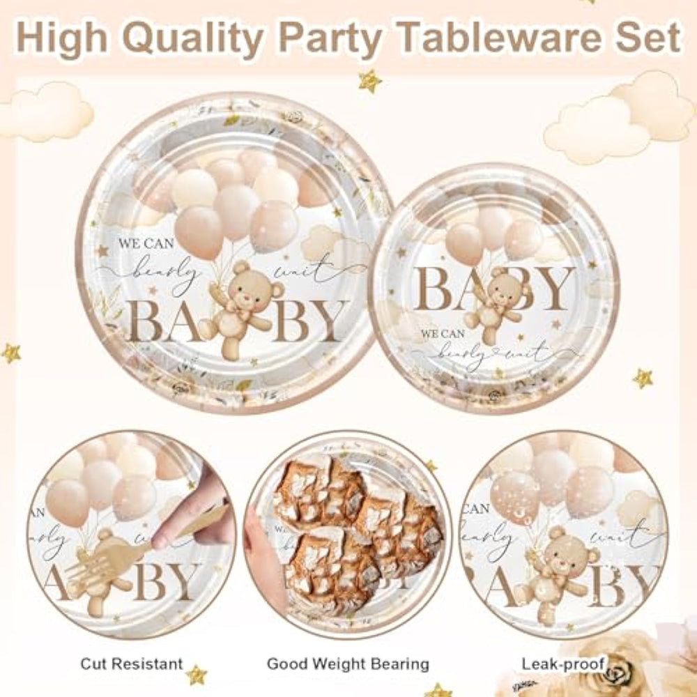 | Bear Baby Shower Supplies: Our Brown Bear Party Set Comes With 24 Paper Plates (9"), 24 Paper Plates (7"), 24 Napkins, 24 Knives, Forks And Spoons, 24 Sturdy Paper Cups (9 Oz); These Tableware Kit Allow You To Serve 24 Guests On A Bear Baby Shower | | Design Advantage: Our Bear Party Dinnerware Tableware Set Is Printed With Bear, Brown Balloons, Clouds And Flowers Patterns To Add A Cute Style To Your Baby Shower | | High Quality Material: The Baby Bear Disposable Dinnerware Are Made Of High-Quality And Environmental Protection Materials; The Dinner Plates Can Easily Carry Cakes, Salads, Fruits And More; The Paper Cups Can Hold Hot And Cold Drinks Without Worrying About Leakage | | Wide Application: Our Brown Bear Plates Supplies Are Suitable For Bear Baby Shower, We Can Bearly Wait Baby Shower Etc | | Enjoy Party Time: 168 Pcs Bear Plates Set Can Provide You With The Perfect Table Service To Host A We Can Bearly Wait Baby Shower Party That Will Impress Your Guests; You Can Also Enjoy Party Time With Family And Friends As Cleanup After The Event Or Party Is Easy | |
