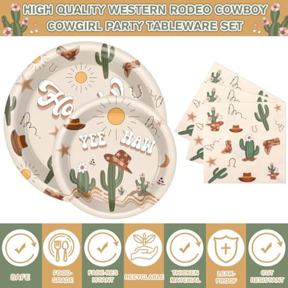 | Rodeo Birthday Party Supplies: The Western Birthday Party Decorations Package Comes With 24 Sets Of Decorative Dinner Plates, Napkins, Disposable Cups, Knives, Forks, And Spoons, A Total Of 168 Pieces; The Diversity In Size Of The Products Offers More Convenience; Large Dinner Plate Measures 9'' While The Small One Is 7''; The Napkin Folded Measures 6.4'', Paper Cup Is 3.5'', Knife Is 7'', And Spork Is 6'', Providing You With Perfectly Sized Utensils For Various Purposes | | Reliable Material: The Plates Of These Western Cowgirl Party Decorations Are Manufactured From Paper Material, Providing A Reliable And Solid Structure; Take Confidence In Knowing Your Plates Can Hold Cake And Might Handle A Playful Toss At The Dessert Table, Making Them A Reliable Choice For Guests' Parties | | Endless Fun: The Party Doesn'T Just Stop At The Western Cowboy Party Decorations; The Rodeo Inspired Design Can Set The Pace For Numerous Engaging Activities; Plan A Birthday Party, A Western Style Baby Shower Or Create An Unforgettable Family Reunion; Using These Party Tools, You Can Improve The Wild West Spirit In Your Guests And Encourage A Fun Filled Memorable Event | | Universal Appeal: Whether You Are Planning A Party For Different People, Our Western Themed Party Decorations Can Create A Cheerful Atmosphere; The Wild West Style Is Something That Most Ages Can Appreciate, Creating An Inclusive Party Experience | | Exquisite Design: Each Item Within This Rodeo Theme Party Decorations Is Exquisitely Designed With A Cactus Bohemian Western Cowboy Style; The Appealing Visuals Create An Atmosphere That Is Fun And Profoundly Memorable | |